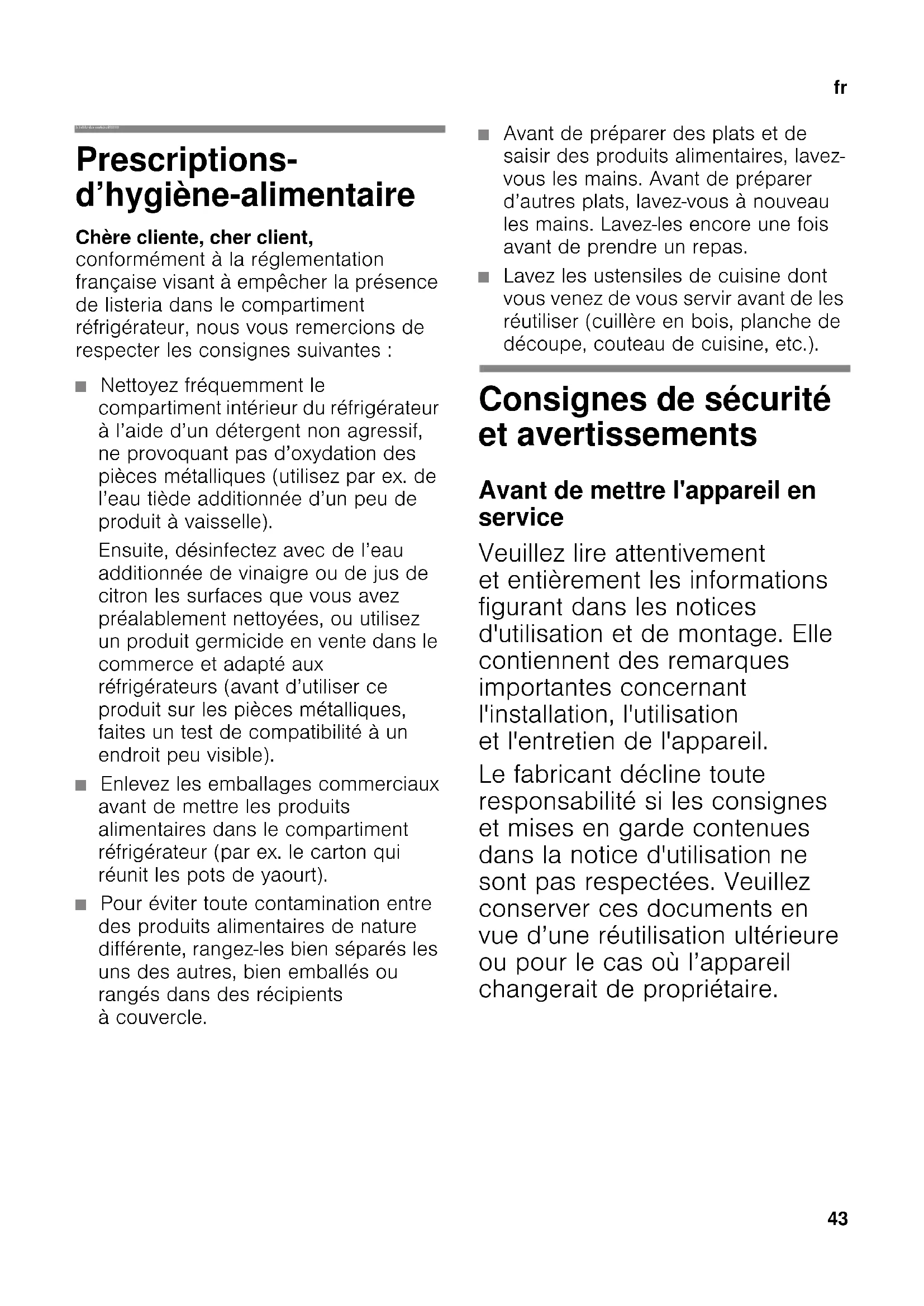 frTable des matièresfrNotice d’utilisationCombiné réfrigérateur-congélateur Prescriptions- d’hygiène-alimentaire Chère cliente, cher client, conformément à la réglementation française visant à empêcher la présence de listeria dans le compartiment réfrigérateur, nous vous remercions de respecter les consignes suivantes : ■ Nettoyez fréquemment le compartiment intérieur du réfrigérateur à l’aide d’un détergent non agressif, ne provoquant pas d’oxydation des pièces métalliques (utilisez par ex. de l’eau tiède additionnée d’un peu de produit à vaisselle). Ensuite, désinfectez avec de l’eau additionnée de vinaigre ou de jus de citron les surfaces que vous avez préalablement nettoyées, ou utilisez un produit germicide en vente dans le commerce et adapté aux réfrigérateurs (avant d’utiliser ce produit sur les pièces métalliques, faites un test de compatibilité à un endroit peu visible). ■ Enlevez les emballages commerciaux avant de mettre les produits alimentaires dans le compartiment réfrigérateur (par ex. le carton qui réunit les pots de yaourt). ■ Pour éviter toute contamination entre des produits alimentaires de nature différente, rangez-les bien séparés les uns des autres, bien emballés ou rangés dans des récipients à couvercle. ■ Avant de préparer des plats et de saisir des produits alimentaires, lavez- vous les mains. Avant de préparer d’autres plats, lavez-vous à nouveau les mains. Lavez-les encore une fois avant de prendre un repas. ■ Lavez les ustensiles de cuisine dont vous venez de vous servir avant de les réutiliser (cuillère en bois, planche de découpe, couteau de cuisine, etc.). Consignes de sécurité et avertissements Avant de mettre l'appareil en service Veuillez lire attentivement et entièrement les informations figurant dans les notices d'utilisation et de montage. Elle contiennent des remarques importantes concernant l'installation, l'utilisation et l'entretien de l'appareil. Le fabricant décline toute responsabilité si les consignes et mises en garde contenues dans la notice d'utilisation ne sont pas respectées. Veuillez conserver ces documents en vue d’une réutilisation ultérieure ou pour le cas où l’appareil changerait de propriétaire.fr