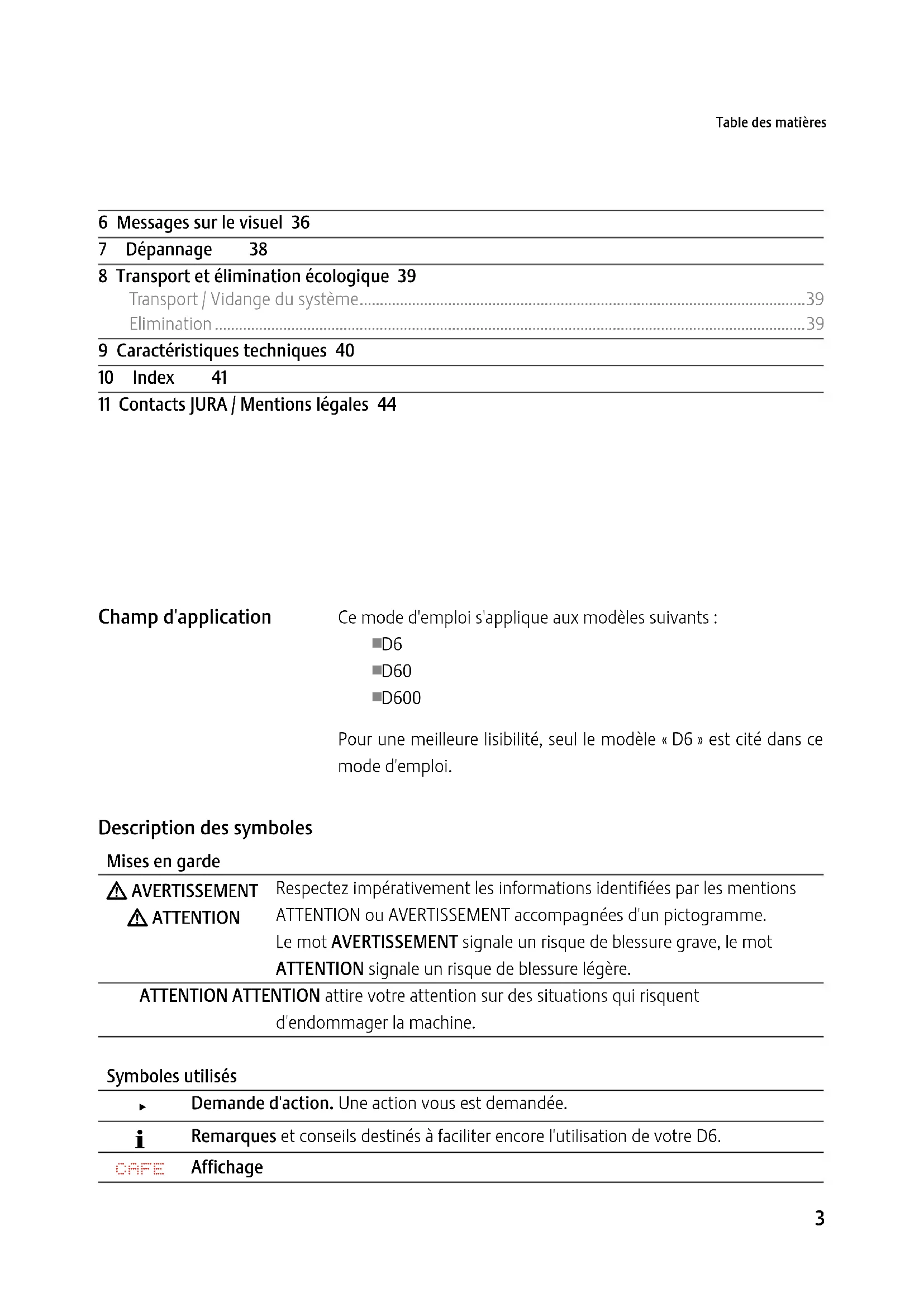 Remarques et conseils destinés à faciliter encore l'utilisation de votre D6. CAFE Affichage Champ d'application Description des symboles4 Eléments de commande Eléments de commande
