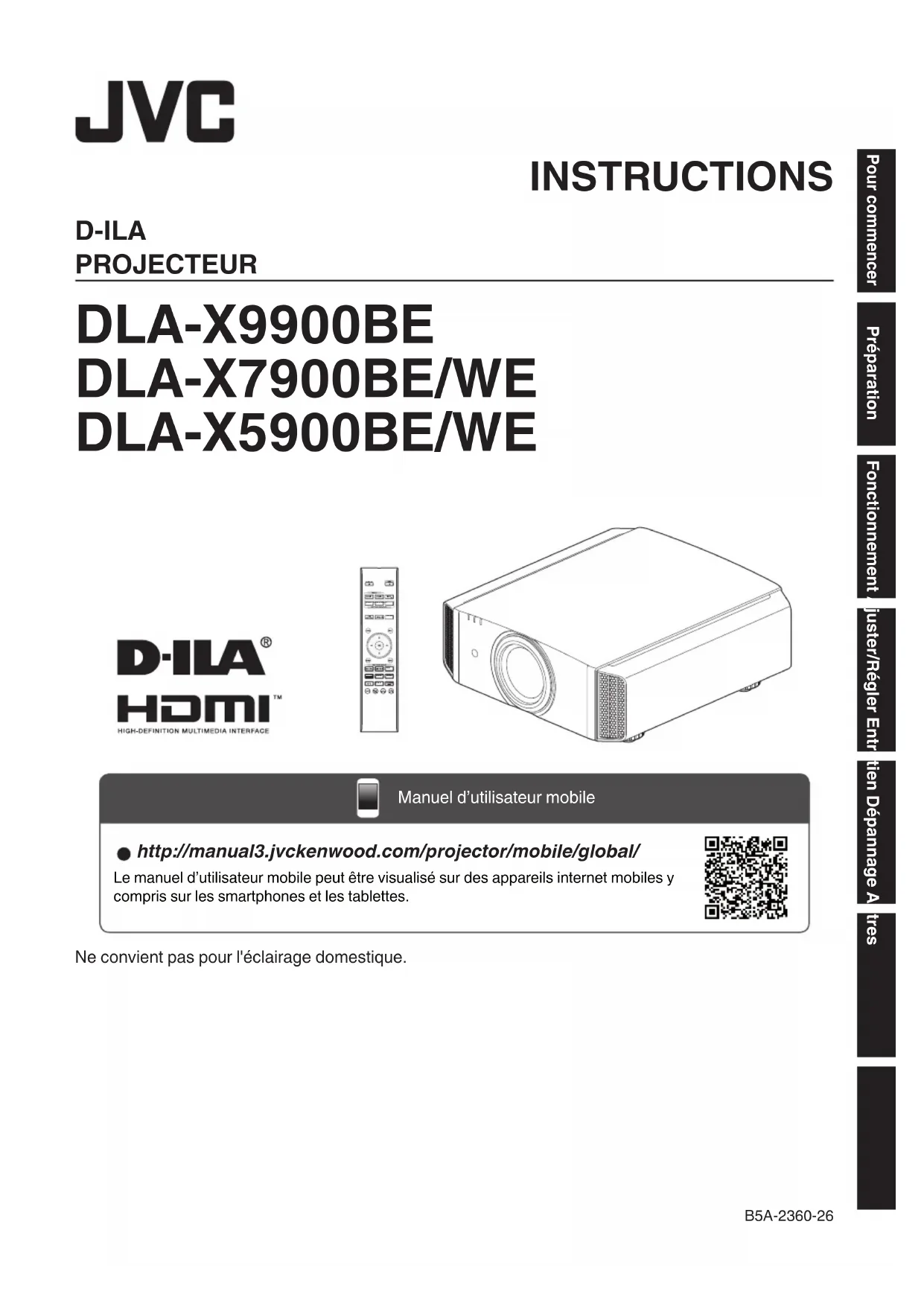 http://manual3.jvckenwood.com/projector/mobile/global/ Le manuel d’utilisateur mobile peut être visualisé sur des appareils internet mobiles y compris sur les smartphones et les tablettes. Manuel d’utilisateur mobile Ne convient pas pour l'éclairage domestique. INSTRUCTIONS B5A-2360-26 Pour commencer Préparation Fonctionnement Ajuster/Régler Entretien Dépannage AutresMesures de sécurité Ce produit a une lampe à décharge à haute intensité (HID) qui contient du mercure. Gérer conformément aux lois relatives à la mise au rebut. La mise au rebut de ces matériaux peut être réglementée dans votre localité pour des raisons environnementales. Pour des informations sur la mise au rebut ou le recyclage, veuillez contacter vos autorités locales ou pour les États-Unis, l’Alliance des industries électroniques : http://www.eiae.org. ou bien appelez 1-800-252-5722 (pour les États-Unis) ou 1-800-964-2650 (pour le Canada). À propos du choix de l’emplacement N’installez pas le projecteur dans un endroit qui ne peut pas soutenir son poids en toute sécurité.Si l’emplacement de l’installation n’est pas suffisamment solide, le projecteur risque de tomber ou de se renverser et de blesser quelqu’un. IMPORTANT INFORMATIONS