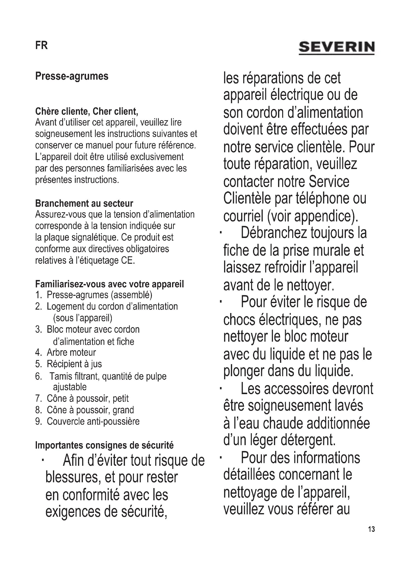 Mise au rebut Les appareils qui portent ce symbole doivent être collectés et traités séparément de vos déchets ménagers, car ils contiennent des matériaux précieux qui peuvent être recyclés. En vous débarrassant correctement de ces appareils, vous contribuez à la prévention de potentiels effets négatifs sur la santé humaine et l’environnement. Votre mairie ou le magasin auprès duquel vous avez acquis l’appareil peuvent vous donner des informations à ce sujet. Garantie Cet appareil est garanti par le fabricant pendant une durée de deux ans à partir deladated‘achat,contretousdéfautsde matière et vices de fabrication. Au cours de cette période, toute pièce défectueuse sera remplacée gratuitement. Cette garantie ne couvrepasl‘usurenormaledel‘appareil, les pièces cassables telles que du verre, des ampoules, etc., ni les détériorations provoquées par une mauvaise utilisation etlenon-respectdumoded‘emploi. Aucunegarantieneseraduesil‘appareil afaitl‘objetd‘uneinterventionàtitre deréparationoud‘entretienpardes personnes non-agréées par nous-mêmes. Cettegarantien‘affectepaslesdroits légaux des consommateurs sous les lois nationales applicables en vigueur, ni les droits du consommateur face au revendeur résultantducontratdevente/d‘achat. Si votre appareil ne fonctionne plus normalement,veuillezl‘adresser,sous emballage solide, à une de nos stations de service après-vente agréées, muni de votre nom et adresse. Si vous retournez votre appareil pendant la période de garantie, n‘oubliezpasdejoindreàvotreenvoi la preuve de garantie (ticket de caisse, factureetc.)certiéeparlevendeur.18 104 x 142 mm Citruspers Geachte klant, Voordat het apparaat gebruikt wordt, de volgende instructies goed doorlezen en deze handleiding bewaren voor toekomstige raadpleging. Dit apparaat mag alleen gebruikt worden door personen die bekend zijn met de gebruiksaanwijzing. Aansluiting op de netvoeding Zorg ervoor dat de netspanning overeenkomt met de spanning die is aangegeven op het typeplaatje. Dit product voldoet aan alle richtlijnen aangegeven op het CE-label. Beschrijving