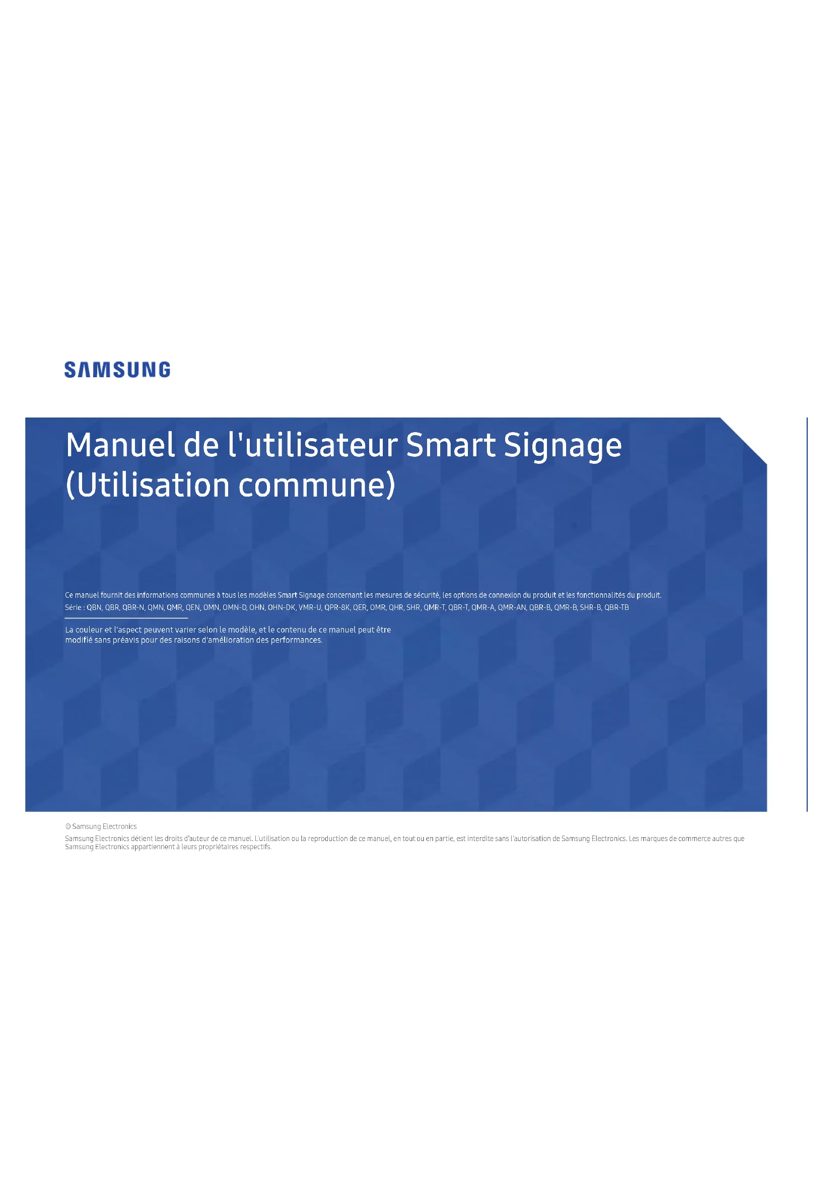 © Samsung Electronics Samsung Electronics détient les droits d'auteur de ce manuel. L'utilisation ou la reproduction de ce manuel, en tout ou en partie, est interdite sans l'autorisation de Samsung Electronics. Les marques de commerce autres que Samsung Electronics appartiennent à leurs propriétaires respectifs. La couleur et l'aspect peuvent varier selon le modèle, et le contenu de ce manuel peut être modié sans préavis pour des raisons d'amélioration des performances. Ce manuel fournit des informations communes à tous les modèles Smart Signage concernant les mesures de sécurité, les options de connexion du produit et les fonctionnalités du produit. Série: QBN, QBR, QBR-N, QMN, QMR, QEN, OMN, OMN-D, OHN, OHN-DK, VMR-U, QPR-8K, QER, OMR, QHR, SHR, QMR-T, QBR-T, QMR-A, QMR-AN, QBR-B, QMR-B, SHR-B, QBR-TB Manuel de l'utilisateur Smart Signage (Utilisation commune)Table des matières Avant l'utilisation Consignes de sécurité 6 Symboles de sécurité 6 Électricité et sécurité 7 Installation de l'appareil 8 Fonctionnement 10 Nettoyage 12 Stockage et entretien 13 Préparation Télécommande 14 Connexion et utilisation d’un périphérique source Avant la connexion 17 Points à vérifier avant la connexion 17 Connexion à un PC 17 Connexion à l'aide d'un câble HDMI 17 Connexion à l'aide d'un câble DP 18 Connexion à l'aide d'un câble DVI (type numérique) 18 Connexion à l'aide d'un câble HDMI-DVI 19