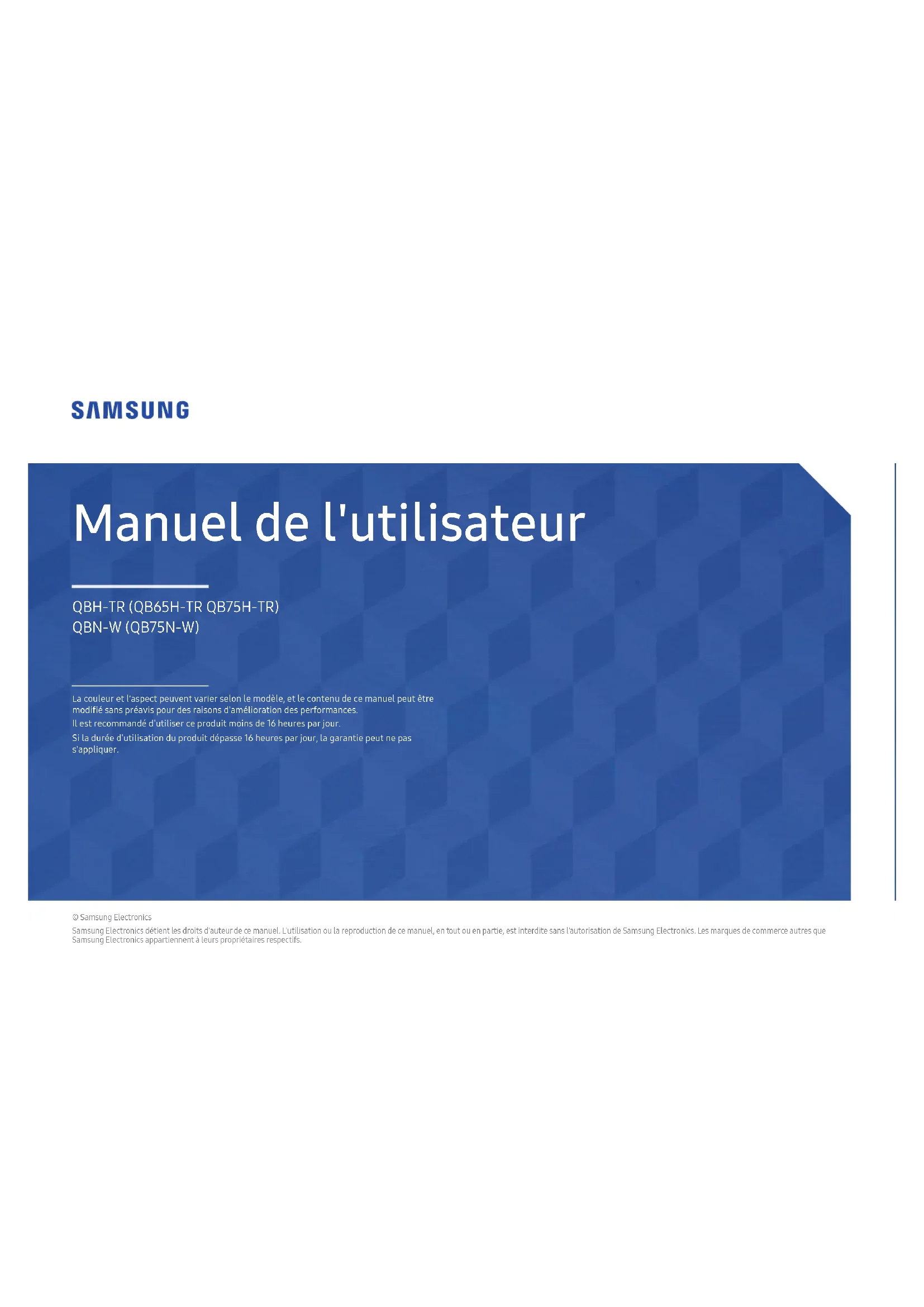 Manuel de l'utilisateur © Samsung Electronics Samsung Electronics détient les droits d'auteur de ce manuel. L'utilisation ou la reproduction de ce manuel, en tout ou en partie, est interdite sans l'autorisation de Samsung Electronics. Les marques de commerce autres que Samsung Electronics appartiennent à leurs propriétaires respectifs. QBH-TR (QB65H-TR QB75H-TR) QBN-W (QB75N-W) La couleur et l'aspect peuvent varier selon le modèle, et le contenu de ce manuel peut être modié sans préavis pour des raisons d'amélioration des performances. Il est recommandé d'utiliser ce produit moins de 16heures par jour. Si la durée d'utilisation du produit dépasse 16heures par jour, la garantie peut ne pas s'appliquer.Table des matières Avant l'utilisation Consignes de sécurité 5 Symboles de sécurité 5 Électricité et sécurité 6 Installation de l'appareil 7 Fonctionnement 9 Nettoyage 11 Stockage et entretien 12 Précautions d'emploi 12 Préparation Vérification des composants 13 Pièces 14 QB65H-TR/QB75H-TR 14 QB75N-W 15 Connecteurs 16 QB65H-TR/QB75H-TR 16 QB75N-W 17 Capteur 18 Utilisation de la fonction tactile 19 Dispositif antivol 19 Télécommande 20 Avant d'installer l'appareil (guide d'installation) 22 Angle d'inclinaison 22 Ventilation 22 Installation du support mural 23 Préparation préalable à l'installation du support mural 23 Installation du support mural 23 Spécifications du nécessaire de support mural (VESA) 24 Utilisation d'un moniteur à écran tactile Moniteur à écran tactile 25 Lisez les informations ci-dessous avant d'utiliser l'appareil 25 Connexion du moniteur à écran tactile 26 Connexion à un PC 26 Configuration des paramètres du moniteur à écran tactile 27 Étalonnage 27 Menu Principal 29 Contrôle de l'écran 30 Gestes sur l'écran tactile 30 Remarques 31 Connexion et utilisation d’un périphérique source Avant la connexion 32 Points à vérifier avant la connexion 32 Connexion à un PC 32 Connexion à l'aide d'un câble HDMI 32 Connexion à l'aide d'un câble DP 33 Connexion à l'aide d'un câble DVI (type numérique) 33 Connexion à l'aide d'un câble HDMI-DVI 34 Connexion à un périphérique vidéo 35 Connexion à l'aide d'un câble HDMI-DVI 35 Connexion à l'aide d'un câble HDMI 36 Connexion à un système audio 36 Connexion du câble LAN 36 Modification de la source d'entrée 37 Ouvrir 37 Espace de travail distant 38 Contrôle multiécran Connexion du câble 39 Câble RS232C 39 Câble LAN 40 Connexion 42 Codes de commande 43 Utilisation du contrôle multiécran 47 2Table des matières Installation/Désinstallation du contrôle multiécran 47 Réglage de l'écran Image Mode 48 Contre-jour / Contraste / Luminosité / Netteté / Couleur / Teinte (V/R) 49 Tempér. couleurs 50 Équilibrage du blanc 51 2points 51 Paramètres des 20points 51 Gamma 52