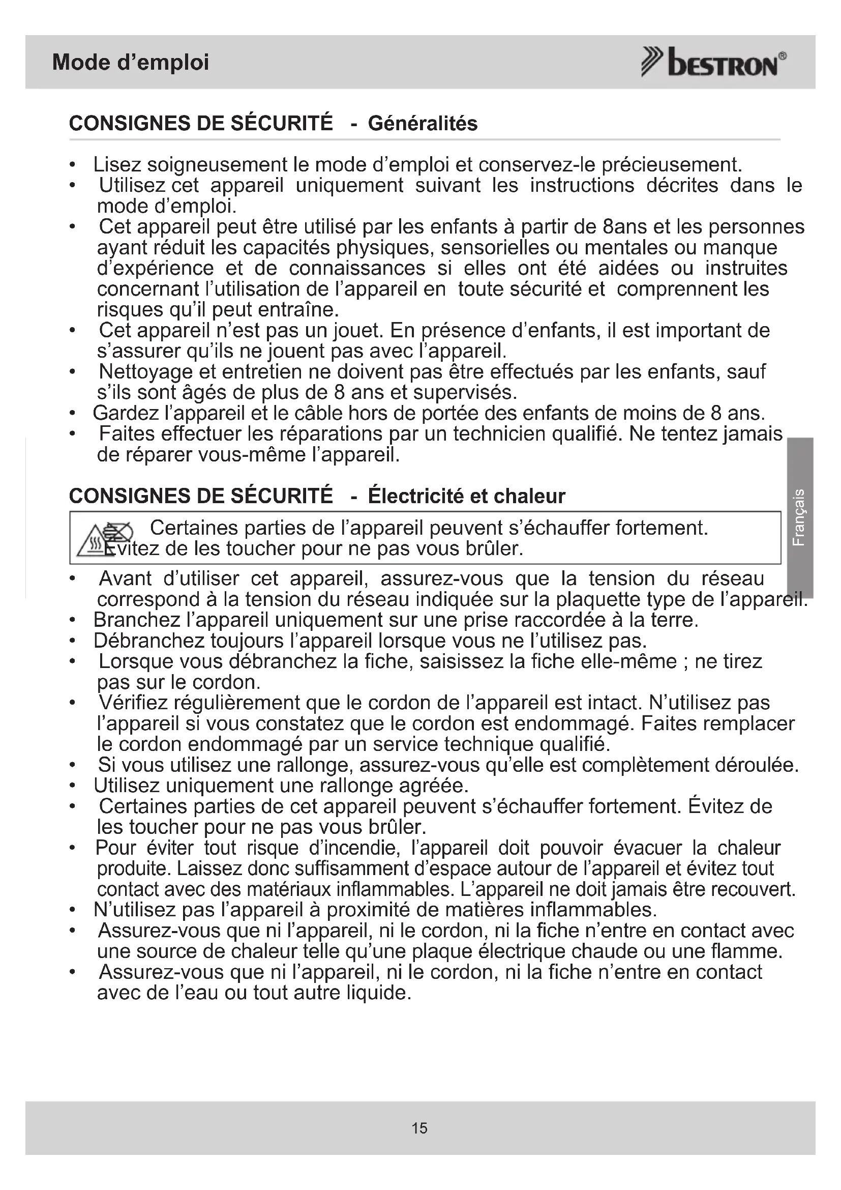 - Faites effectuer les réparations par un technicien qualifié. Ne tentez jamais de réparer vous-même l’appareil. CONSIGNES DE SÉCURITÉ - Électricité et chaleur