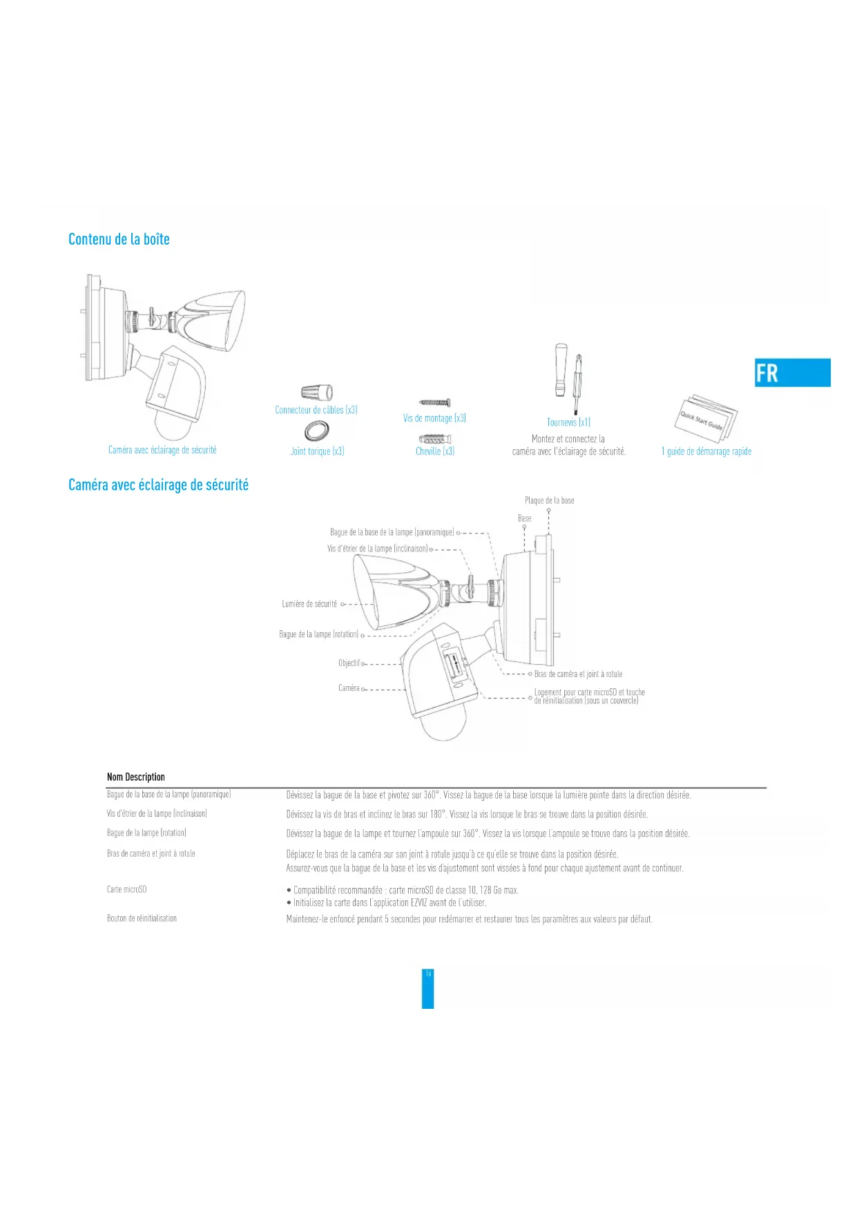- Si la señal de su red wifi es inferior al 50% en el lugar donde desea instalar la cámara-lámpara de seguridad, se recomienda aumentar la señal en el punto de instalación usando un extensor wifi.15 Apéndice Instalación de una tarjeta de memoria (opcional) - Retire la tapa del lateral de la cámara. - Extraiga el tapón de silicona. - Inserte la tarjeta microSD en la ranura hasta encajarla. - Ponga de nuevo la tapa de silicona y asegúrese de que esté completamente colocada en la ranura de la tarjeta SD. - Vuelva a colocar la tapa. Inicializar la tarjeta de memoria 1. En la aplicación EZVIZ, compruebe el estado de la tarjeta de memoria tocando en la opción Storage Status (Estado de almacenamiento) de la interfaz de Device Settings (Ajustes del dispositivo). 2. Si el estado de la tarjeta de memoria aparece como Uninitialized (No inicializada), tóquelo para inicializarla. Tras ello, el estado cambiará a Normal. Para obtener información detallada, visite www.ezvizlife.com.16 Contenu de la boîte Caméra avec éclairage de sécurité Connecteur de câbles (x3) Joint torique (x3) Vis de montage (x3) Cheville (x3) Tournevis (x1) Montez et connectez la caméra avec l'éclairage de sécurité. 1guide de démarrage rapide Caméra avec éclairage de sécurité Base Plaque de la base Bague de la base de la lampe (panoramique) Vis d'étrier de la lampe (inclinaison) Bague de la lampe (rotation) Bras de caméra et joint à rotule Logement pour carte microSD et touche de réinitialisation (sous un couvercle) Objectif Caméra Lumière de sécurité Nom Description Bague de la base de la lampe (panoramique) Dévissez la bague de la base et pivotez sur 360°. Vissez la bague de la base lorsque la lumière pointe dans la direction désirée. Vis d'étrier de la lampe (inclinaison) Dévissez la vis de bras et inclinez le bras sur 180°. Vissez la vis lorsque le bras se trouve dans la position désirée. Bague de la lampe (rotation) Dévissez la bague de la lampe et tournez l’ampoule sur 360°. Vissez la vis lorsque l’ampoule se trouve dans la position désirée. Bras de caméra et joint à rotule Déplacez le bras de la caméra sur son joint à rotule jusqu’à ce qu’elle se trouve dans la position désirée. Assurez-vous que la bague de la base et les vis d’ajustement sont vissées à fond pour chaque ajustement avant de continuer. Carte microSD