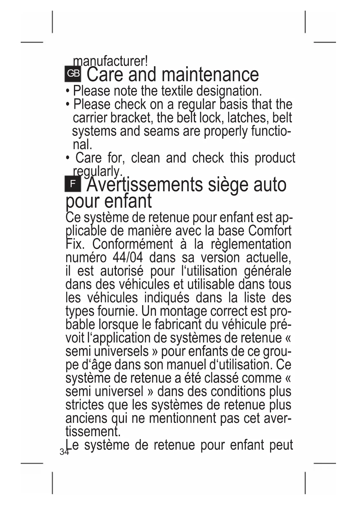 Avertissements siège auto pour enfant Ce système de retenue pour enfant est ap- plicable de manière avec la base Comfort Fix. Conformément à la règlementation numéro 44/04 dans sa version actuelle, il est autorisé pour l‘utilisation générale dans des véhicules et utilisable dans tous les véhicules indiqués dans la liste des types fournie. Un montage correct est pro- bable lorsque le fabricant du véhicule pré- voit l‘application de systèmes de retenue « semi universels » pour enfants de ce grou- pe d‘âge dans son manuel d‘utilisation. Ce système de retenue a été classé comme « semi universel » dans des conditions plus strictes que les systèmes de retenue plus anciens qui ne mentionnent pas cet aver- tissement. Le système de retenue pour enfant peut35 être utilisé dans des véhicules sans base avec une ceinture 3 points déroulable lors- que ceux-ci ont été contrôlés et autorisés selon la norme ECE R16 ou autre norme comparable.