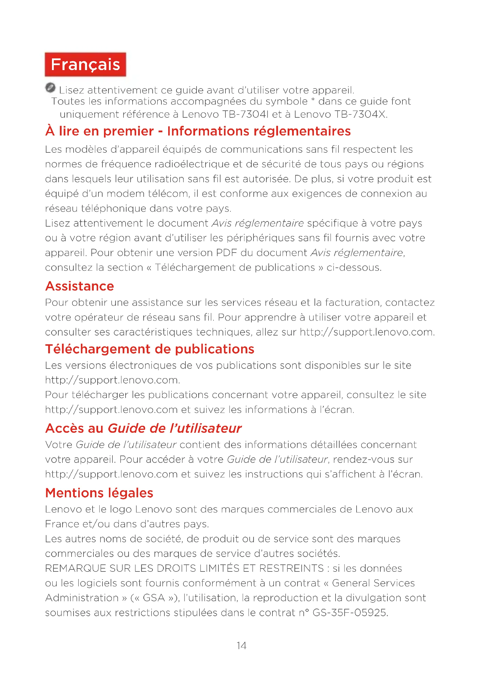 Français Lisez attentivement ce guide avant d’utiliser votre appareil. Toutes les informations accompagnées du symbole * dans ce guide font uniquement référence à Lenovo TB-7304I et à Lenovo TB-7304X. À lire en premier - Informations réglementaires Les modèles d’appareil équipés de communications sans fil respectent les normes de fréquence radioélectrique et de sécurité de tous pays ou régions dans lesquels leur utilisation sans fil est autorisée. De plus, si votre produit est équipé d’un modem télécom, il est conforme aux exigences de connexion au réseau téléphonique dans votre pays. Lisez attentivement le document Avis réglementaire spécifique à votre pays ou à votre région avant d’utiliser les périphériques sans fil fournis avec votre appareil. Pour obtenir une version PDF du document Avis réglementaire, consultez la section «Téléchargement de publications» ci-dessous. Assistance Pour obtenir une assistance sur les services réseau et la facturation, contactez votre opérateur de réseau sans fil. Pour apprendre à utiliser votre appareil et consulter ses caractéristiques techniques, allez sur http://support.lenovo.com. Téléchargement de publications Les versions électroniques de vos publications sont disponibles sur le site http://support.lenovo.com. Pour télécharger les publications concernant votre appareil, consultez le site http://support.lenovo.com et suivez les informations à l’écran. Accès au Guide de l’utilisateur Votre Guide de l’utilisateur contient des informations détaillées concernant votre appareil. Pour accéder à votre Guide de l’utilisateur, rendez-vous sur http://support.lenovo.com et suivez les instructions qui s’affichent à l’écran. Mentions légales Lenovo et le logo Lenovo sont des marques commerciales de Lenovo aux France et/ou dans d’autres pays. Les autres noms de société, de produit ou de service sont des marques commerciales ou des marques de service d’autres sociétés. REMARQUE SUR LES DROITS LIMITÉS ET RESTREINTS: si les données ou les logiciels sont fournis conformément à un contrat «General Services Administration» («GSA»), l’utilisation, la reproduction et la divulgation sont soumises aux restrictions stipulées dans le contrat n°GS-35F-05925.15 Présentation de l’appareil Dénomination du modèle Version Lenovo TB-7304F WLAN Lenovo TB-7304I WLAN + WCDMA Lenovo TB-7304X WLAN + LTE