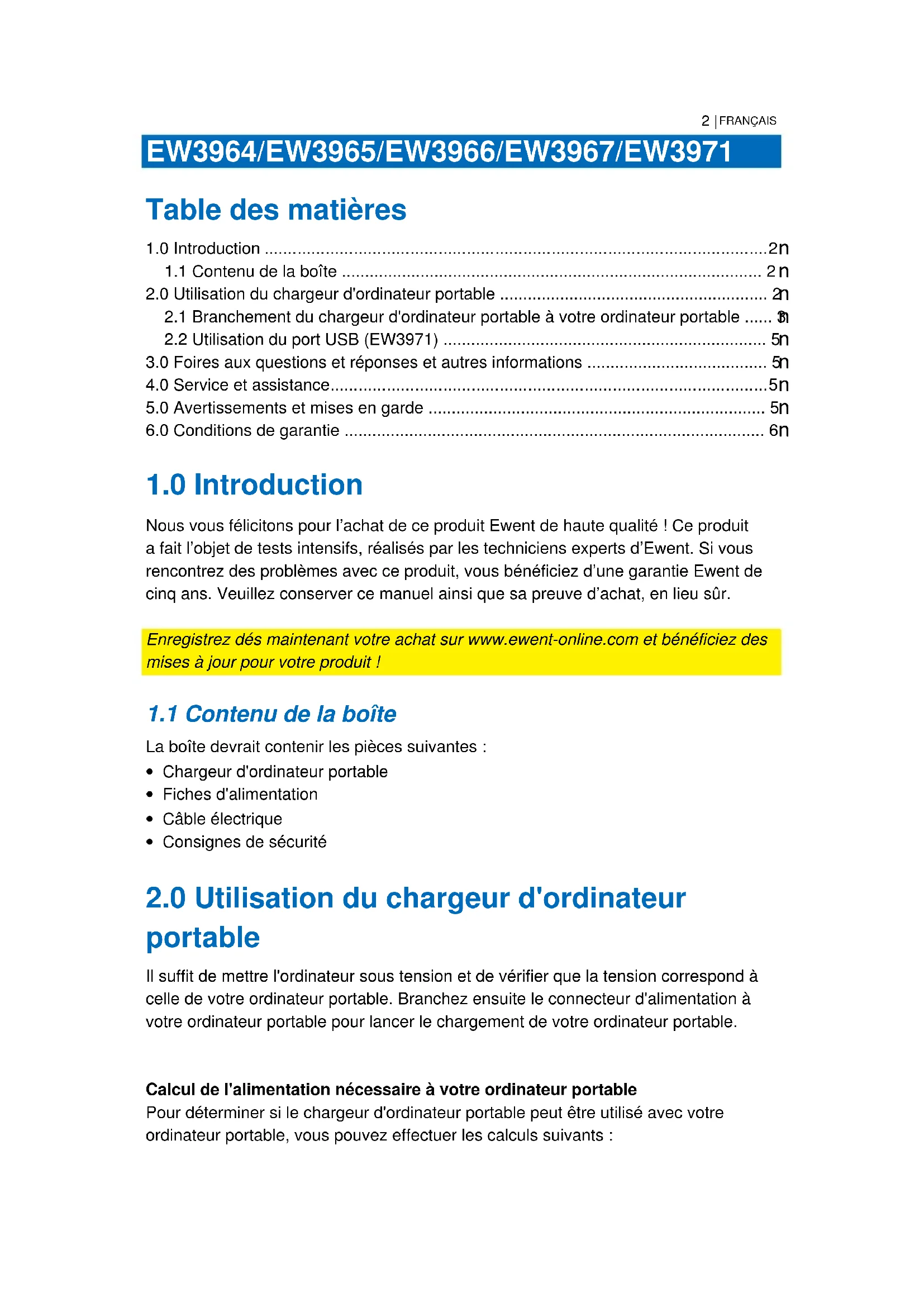 Nous vous félicitons pour l'achat de ce produit Ewent de haute qualité ! Ce produit a fait l'objet de tests intensifs, réalisés par les techniciens experts d'Ewent. Si vous rencontrez des problèmes avec ce produit, vous bénéficiez d'une garantie Ewent de cinq ans. Veuillez conserver ce manuel ainsi que sa preuve d'achat, en lieu sûr.