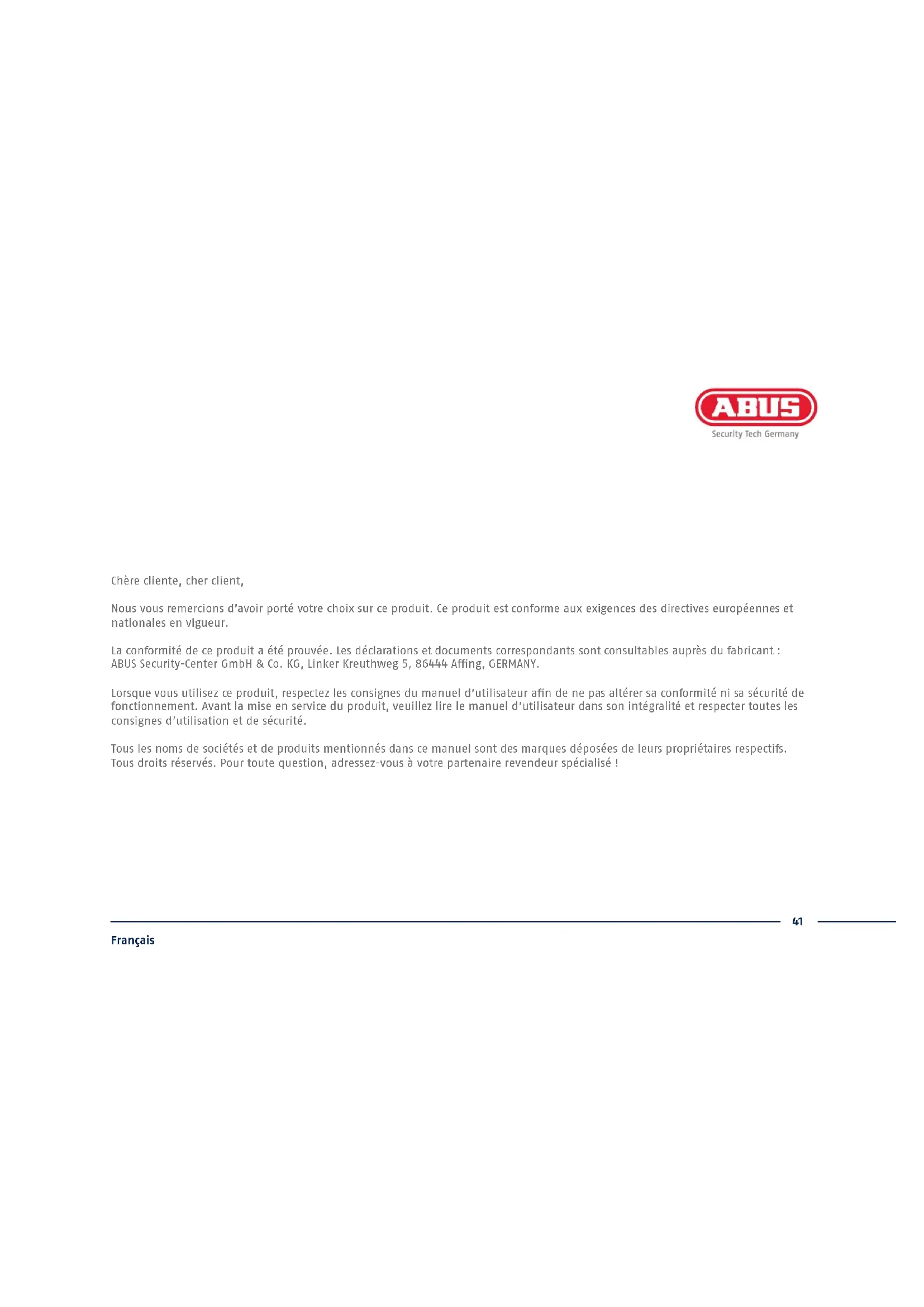 Ce guide de démarrage rapide décrit les premières étapes d’installation de votre enregistreur IP. Pour plus d’informations, consultez la notice d’utilisation.41 Français Chère cliente, cher client, Nous vous remercions d’avoir porté votre choix sur ce produit. Ce produit est conforme aux exigences des directives européennes et nationales en vigueur. La conformité de ce produit a été prouvée. Les déclarations et documents correspondants sont consultables auprès du fabricant: ABUS Security-Center GmbH & Co. KG, Linker Kreuthweg 5, 86444 Ang, GERMANY. Lorsque vous utilisez ce produit, respectez les consignes du manuel d’utilisateur an de ne pas altérer sa conformité ni sa sécurité de fonctionnement. Avant la mise en service du produit, veuillez lire le manuel d’utilisateur dans son intégralité et respecter toutes les consignes d’utilisation et de sécurité. Tous les noms de sociétés et de produits mentionnés dans ce manuel sont des marques déposées de leurs propriétaires respectifs. Tous droits réservés. Pour toute question, adressez-vous à votre partenaire revendeur spécialisé!42 Français