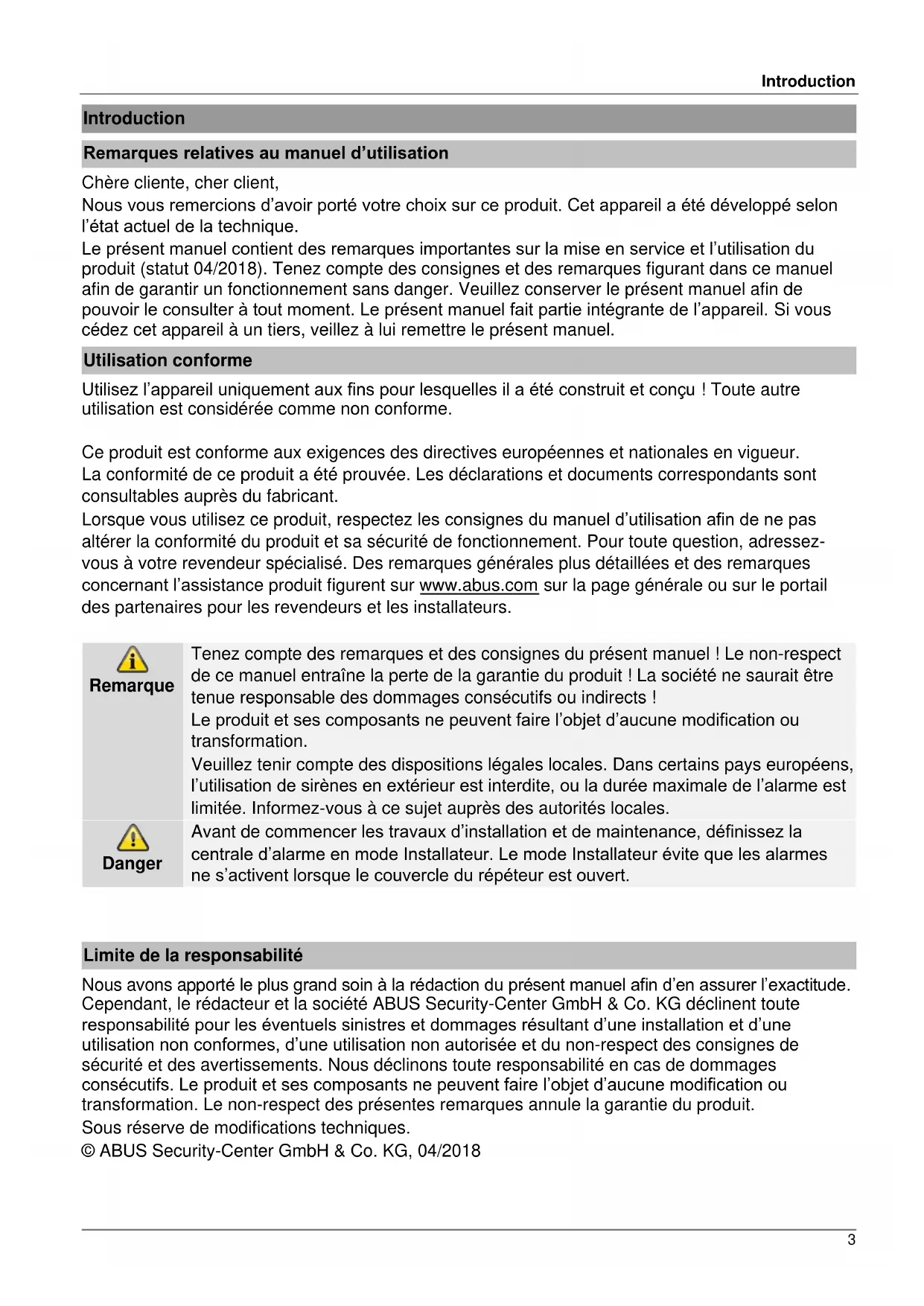 Limite de la responsabilité Nous avons apporté le plus grand soin à la rédaction du présent manuel afin d’en assurer l’exactitude. Cependant, le rédacteur et la société ABUS Security-Center GmbH & Co. KG déclinent toute responsabilité pour les éventuels sinistres et dommages résultant d’une installation et d’une utilisation non conformes, d’une utilisation non autorisée et du non-respect des consignes de sécurité et des avertissements. Nous déclinons toute responsabilité en cas de dommages consécutifs. Le produit et ses composants ne peuvent faire l’objet d’aucune modification ou transformation. Le non-respect des présentes remarques annule la garantie du produit. Sous réserve de modifications techniques. © ABUS Security-Center GmbH & Co. KG, 04/2018Consignes de sécurité