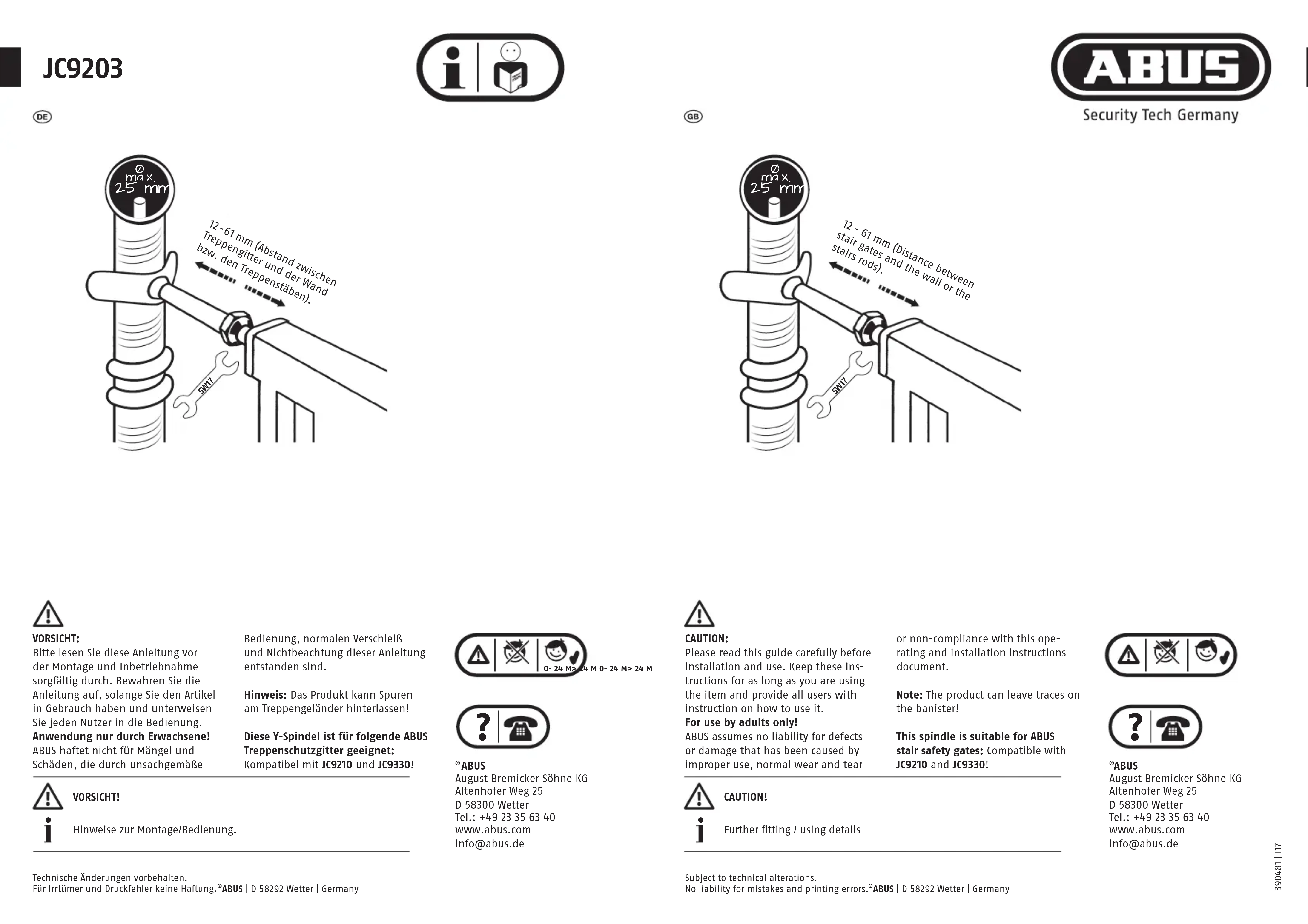 ATTENTION ! ATTENTION: Veuillez lire cette notice attentive- ment avant le montage et la mise en service. Conservez cette notice tant que vous utilisez l‘article. Tous les utilisateurs doivent en prendre connaissance. Utilisation exclusivement réservée aux adultes ! ABUS décline toute responsabilité pour des vices et dommages résul- tant d’une utilisation incorrecte, de l’usure normale ou de la non-observation des présentes instructions. Remarque: Le produit peut laisser des marques sur la rampe d‘escalier ! Cette broche est adapté pour les portes de sécurité d‘escalier ABUS: Compatible avec JC9210 et JC9330! Ci si riservano modiche tecniche. Per errori e refusi di stampa non ci si assume alcuna responsabilità. ABUS | D 58292 Wetter | Germany Note per I‘installazione / uso