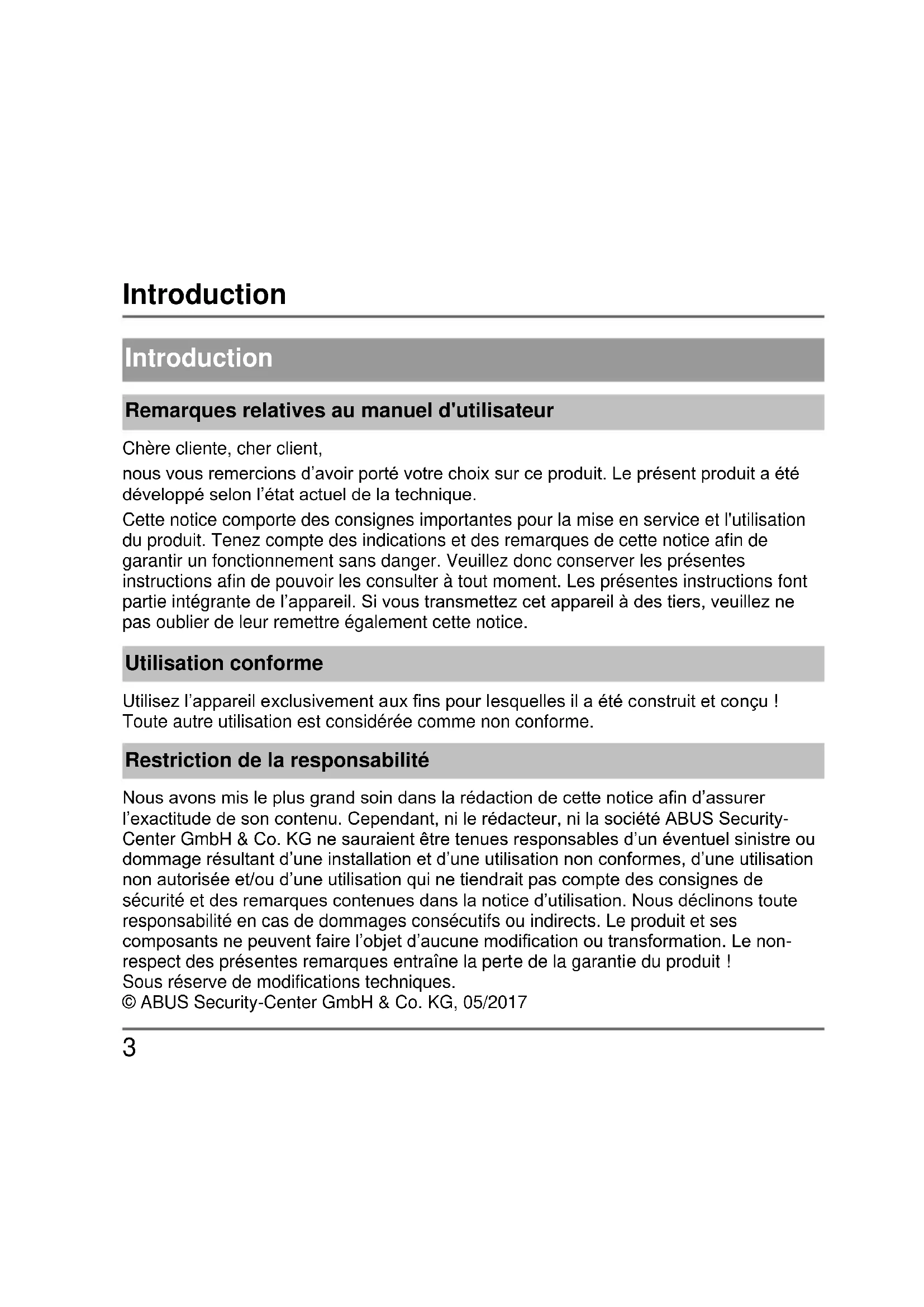 Introduction Remarques relatives au manuel d'utilisateur Chère cliente, cher client, nous vous remercions d’avoir porté votre choix sur ce produit. Le présent produit a été développé selon l’état actuel de la technique. Cette notice comporte des consignes importantes pour la mise en service et l'utilisation du produit. Tenez compte des indications et des remarques de cette notice afin de garantir un fonctionnement sans danger. Veuillez donc conserver les présentes instructions afin de pouvoir les consulter à tout moment. Les présentes instructions font partie intégrante de l’appareil. Si vous transmettez cet appareil à des tiers, veuillez ne pas oublier de leur remettre également cette notice. Utilisation conforme Utilisez l’appareil exclusivement aux fins pour lesquelles il a été construit et conçu ! Toute autre utilisation est considérée comme non conforme. Restriction de la responsabilité Nous avons mis le plus grand soin dans la rédaction de cette notice afin d’assurer l’exactitude de son contenu. Cependant, ni le rédacteur, ni la société ABUS Security- Center GmbH & Co. KG ne sauraient être tenues responsables d’un éventuel sinistre ou dommage résultant d’une installation et d’une utilisation non conformes, d’une utilisation non autorisée et/ou d’une utilisation qui ne tiendrait pas compte des consignes de sécurité et des remarques contenues dans la notice d’utilisation. Nous déclinons toute responsabilité en cas de dommages consécutifs ou indirects. Le produit et ses composants ne peuvent faire l’objet d’aucune modification ou transformation. Le non- respect des présentes remarques entraîne la perte de la garantie du produit ! Sous réserve de modifications techniques. © ABUS Security-Center GmbH & Co. KG, 05/2017Consignes de sécurité