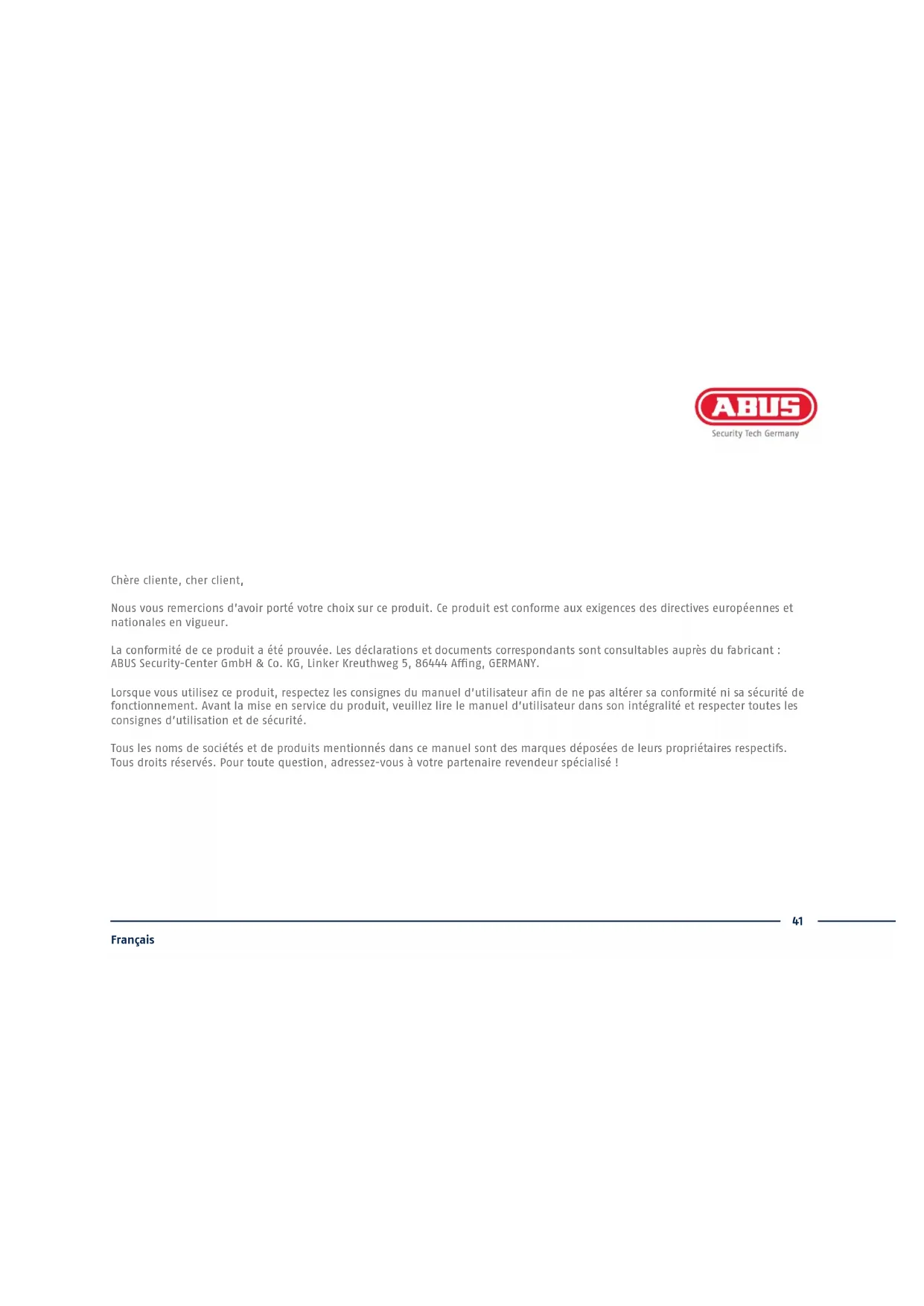 Ce guide de démarrage rapide décrit les premières étapes d’installation de votre enregistreur IP. Pour plus d’informations, consultez la notice d’utilisation.41 Français Chère cliente, cher client, Nous vous remercions d’avoir porté votre choix sur ce produit. Ce produit est conforme aux exigences des directives européennes et nationales en vigueur. La conformité de ce produit a été prouvée. Les déclarations et documents correspondants sont consultables auprès du fabricant: ABUS Security-Center GmbH & Co. KG, Linker Kreuthweg 5, 86444 Ang, GERMANY. Lorsque vous utilisez ce produit, respectez les consignes du manuel d’utilisateur an de ne pas altérer sa conformité ni sa sécurité de fonctionnement. Avant la mise en service du produit, veuillez lire le manuel d’utilisateur dans son intégralité et respecter toutes les consignes d’utilisation et de sécurité. Tous les noms de sociétés et de produits mentionnés dans ce manuel sont des marques déposées de leurs propriétaires respectifs. Tous droits réservés. Pour toute question, adressez-vous à votre partenaire revendeur spécialisé!42 Français