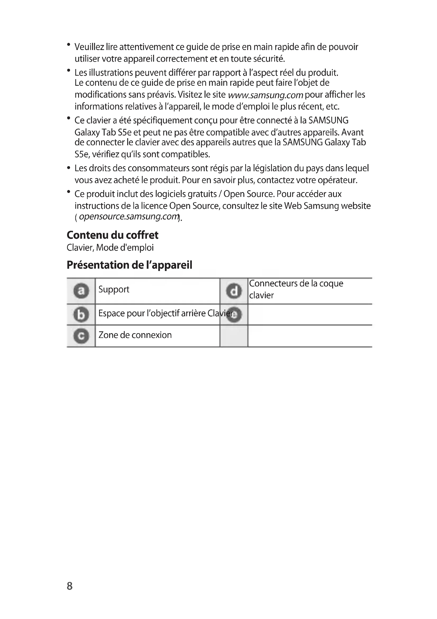 Ce clavier a été spécifiquement conçu pour être connecté à la SAMSUNG Galaxy Tab S5e et peut ne pas être compatible avec d’autres appareils. Avant de connecter le clavier avec des appareils autres que la SAMSUNG Galaxy Tab S5e, vérifiez qu’ils sont compatibles.