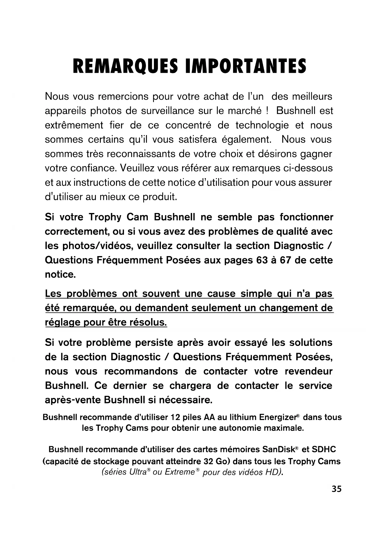 Nos de modèle: 119466 / 119467 Lit No 98-2019 / 4-11 FrANçAIS VIDEO35 REMARQUES IMPORTANTES Nous vous remercions pour votre achat de l’un des meilleurs appareils photos de surveillance sur le marché ! Bushnell est extrêmement fier de ce concentré de technologie et nous sommes certains qu’il vous satisfera également. Nous vous sommes très reconnaissants de votre choix et désirons gagner votre confiance. Veuillez vous référer aux remarques ci-dessous et aux instructions de cette notice d’utilisation pour vous assurer d'utiliser au mieux ce produit. Si votre Trophy Cam Bushnell ne semble pas fonctionner correctement, ou si vous avez des problèmes de qualité avec les photos/vidéos, veuillez consulter la section Diagnostic / Questions Fréquemment Posées aux pages 63 à 67 de cette notice. Les problèmes ont souvent une cause simple qui n’a pas été remarquée, ou demandent seulement un changement de réglage pour être résolus. Si votre problème persiste après avoir essayé les solutions de la section Diagnostic / Questions Fréquemment Posées, nous vous recommandons de contacter votre revendeur Bushnell. Ce dernier se chargera de contacter le service après-vente Bushnell si nécessaire. Bushnell recommande d’utiliser 12 piles AA au lithium Energizer