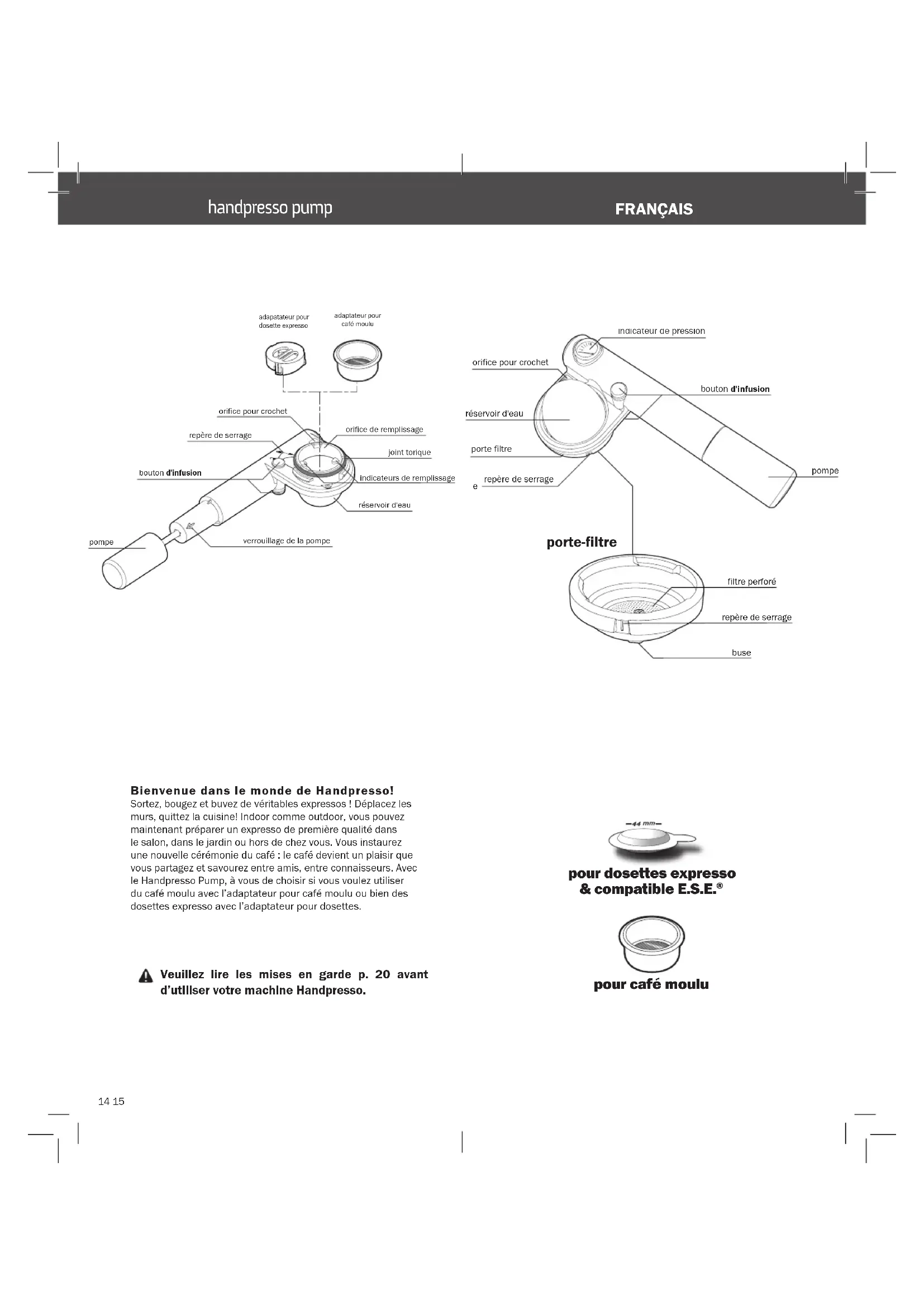 - If you burn yourself, immediately pour cold water on the burnt area and call a doctor if necessary.14 15 porte-filtre buse filtre perforé repère de serrageorifice de remplissagejoint toriqueréservoir d'eauindicateurs de remplissageverrouillage de la pompepompeorifice pour crochetrepère de serragebouton d'infusionpompe bouton d'infusion indicateur de pression réservoir d'eau orifice pour crochet porte filtre repère de serrage Veuillez lire les mises en garde p. 20 avant d’utiliser votre machine Handpresso. Bienvenue dans le monde de Handpresso! Sortez, bougez et buvez de véritables expressos ! Déplacez les murs, quittez la cuisine! Indoor comme outdoor, vous pouvez maintenant préparer un expresso de première qualité dans le salon, dans le jardin ou hors de chez vous. Vous instaurez une nouvelle cérémonie du café : le café devient un plaisir que vous partagez et savourez entre amis, entre connaisseurs. Avec le Handpresso Pump, à vous de choisir si vous voulez utiliser du café moulu avec l’adaptateur pour café moulu ou bien des dosettes expresso avec l’adaptateur pour dosettes.adaptateur pour café mouluadapatateur pour dosette expresso FRANÇAIS porte-filtre buse filtre perforérepère de serrage orifice de remplissage joint toriqueréservoir d'eau indicateurs de remplissage verrouillage de la pompe pompe orifice pour crochet repère de serrage bouton d'infusion pompebouton d'infusionindicateur de pressionréservoir d'eauorifice pour crochetporte filtrerepère de serrage pour café moulu pour dosettes expresso & compatible E.S.E.