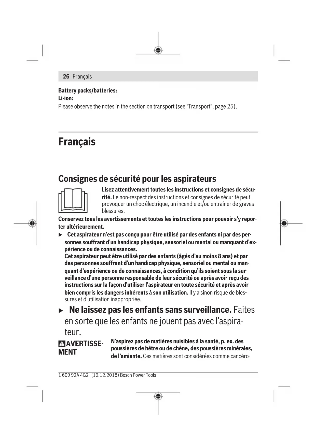 (6) soit fermé pendant l’utilisation de l’outil. Vous évitez ainsi toute pénétration de poussière. Bosch Power Tools 1 609 92A 4G2 | (19.12.2018)32 | Français Mise en marche u Avant d’aspirer, assurez-vous que l’unité de filtrage est correctement montée. u Assurez-vous que le filtre est en parfait état (sans fissures, petits trous, etc.). Remplacez aussitôt le filtre s’il est endommagé. Mise en marche/arrêt – Pour mettre en marche l’aspirateur, actionnez la touche Marche / Arrêt (2). – Pour arrêter l’aspirateur, actionnez à nouveau la touche Marche / Arrêt (2). Entretien et Service après‑vente Nettoyage et entretien u Retirez l’accu avant de nettoyer l’aspirateur, d’effectuer des réglages, de chan- ger d’accessoire ou de ranger l’aspirateur. Cette mesure de précaution prévient toute mise en marche intempestive de l’aspirateur. u Toujours tenir propres l’outil électroportatif ainsi que les fentes de ventilation afin d’obtenir un travail impeccable et sûr. – Nettoyez de temps en temps le carter de l’aspirateur avec un chiffon humide. – Nettoyez avec un chiffon sec les contacts de charge quand ils sont sales. Nettoyage du bac à poussière (voir figuresC1–C2) Pour que l’aspirateur conserve sa capacité d’aspiration maximale, nettoyez le bac à pous- sière(8) après chaque utilisation. – Penchez légèrement l’aspirateur afin que la poussière présente dans le bac à pous- sière ne tombe pas lors de l’ouverture de l’aspirateur. – Appuyez sur la touche de déverrouillage(1) et dégagez le bac à poussière(8) du car- ter moteur(7). – Secouez le bac à poussière(8) au-dessus d’un conteneur à déchets approprié. – Si nécessaire, nettoyez les filtres(voir « Nettoyage du filtre (voir figuresD1–D5) », Page32). – Positionnez ensuite le bac à poussière(8) au bas du carter moteur (7) et fermez-le en le basculant vers l’arrière, jusqu’à ce qu’il s’enclenche de manière audible. Nettoyage du filtre (voir figuresD1–D5) Le filtre à poussière fine(15) ne doit pas être nettoyé avec un liquide. – Penchez légèrement l’aspirateur afin que la poussière présente dans le bac à pous- sière ne tombe pas lors de l’ouverture de l’aspirateur. 1 609 92A 4G2 | (19.12.2018) Bosch Power ToolsFrançais | 33 – Appuyez sur la touche de déverrouillage (1) et dégagez le bac à poussière (8) du car- ter moteur (7). – Brosser le filtre grossier(14). – Tournez l’unité de filtrage (filtre grossier(14) et filtre à poussière fine(15)) jusqu’en butée dans le sens « cadenas ouvert » et dégagez-la du carter moteur. – Séparez le filtre à poussière fine(15) du filtre grossier (14) à l’aide de la broche d’ex- traction(16). – Tapotez avec précaution le filtre à poussière fine (15) contre le bord d’un conteneur à déchets approprié. En cas de besoin, brossez les lamelles du filtre avec une brosse souple. – La repose s’effectue dans l’ordre inverse. Dérangements Au cas où la puissance d’aspiration est insuffisante, contrôlez les points suivants: – Le bac à poussière(8) est-il plein? ▷ (voir « Nettoyage du bac à poussière (voir figuresC1–C2) », Page32) – Les filtres((14)/(15)) sont-ils chargés de poussière ? ▷ (voir « Nettoyage du filtre (voir figuresD1–D5) », Page32) – Le niveau de charge de l’accu (3) est-il trop faible ? ▷ (voir « Recharge de l’accu (voir figure A) », Page29) Un vidage régulier du bac à poussière et un nettoyage régulier des filtres permettent de toujours disposer de la capacité d’aspiration maximale. Au cas où la puissance d’aspiration reste néanmoins insuffisante, envoyez l’aspirateur au service après-vente. Service après-vente et conseil utilisateurs Notre Service après-vente répond à vos questions concernant la réparation et l’entretien de votre produit et les pièces de rechange. Vous trouverez des vues éclatées et des infor- mations sur les pièces de rechange sur le site : www.bosch-pt.com L’équipe de conseil utilisateurs Bosch se tient à votre disposition pour répondre à vos questions concernant nos produits et leurs accessoires. Lors de toute demande de renseignement ou commande de pièces de rechange, préci- sez impérativement la référence à 10chiffres figurant sur l’étiquette signalétique du pro- duit. France Réparer un outil Bosch n’a jamais été aussi simple, et ce, en moins de 5 jours, grâce à SAV DIRECT, notre formulaire de retour en ligne que vous trouverez sur notre site inter- net www.bosch-pt.fr à la rubrique Services. Bosch Power Tools 1 609 92A 4G2 | (19.12.2018)34 | Français Vous y trouverez également notre boutique de pièces détachées en ligne où vous pouvez passer directement vos commandes. Vous êtes un utilisateur, contactez : Le Service Clientèle Bosch Outillage Electroportatif Tel. : 0811 360122 (coût d'une communication locale) E-Mail : sav.outillage-electroportatif@fr.bosch.com Vous êtes un revendeur, contactez : Robert Bosch (France) S.A.S. Service Après-Vente Electroportatif 126, rue de Stalingrad 93705 DRANCY Cédex Tel. : (01) 43119006 E-Mail : sav-bosch.outillage@fr.bosch.com Belgique, Luxembourg Tel. : +32 2 588 0589 Fax : +32 2 588 0595 E-Mail : outillage.gereedschap@be.bosch.com Suisse Passez votre commande de pièces détachées directement en ligne sur notre site www.bosch-pt.com/ch/fr. Tel. : (044) 8471512 Fax : (044) 8471552 E-Mail : Aftersales.Service@de.bosch.com Transport Les accus Lithium-ion sont soumis à la réglementation relative au transport de matières dangereuses. Pour le transport par voie routière, aucune mesure supplémentaire n’a be- soin d’être prise. Lors d’une expédition par un tiers (parex.transport aérien ou entreprise de transport), des mesures spécifiques doivent être prises concernant l’emballage et le marquage. Pour la préparation de l’envoi, faites-vous conseiller par un exp