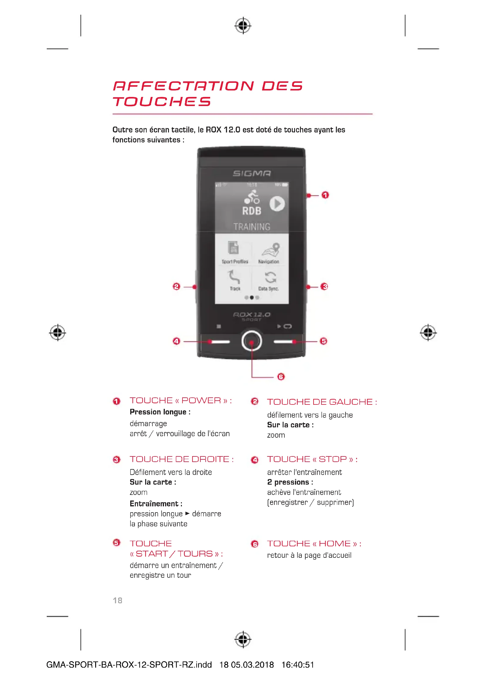 We, SIGMA-ELEKTRO GmbH, Dr.-Julius-Leber-Str. 15, D-67433 Neustadt / Weinstraße, declare that the bike computer ROX 12.0 and the transmitters R1 Duo and R2 Duo, when used as intended, comply with the basic requirements of RED Directive 2014/53/EU and RoHS Directive 2011/65/EU. SIGMA-SPORT-BA-ROX-12-SPORT-RZ.indd 17 05.03.2018 16:40:4918 AFFECTATION DES TOUCHES Outre son écran tactile, le ROX 12.0 est doté de touches ayant les fonctions suivantes: TOUCHE «POWER»: Pression longue: démarrage arrêt / verrouillage de l'écran TOUCHE DE DROITE: Défilement vers la droite Sur la carte: zoom Entraînement: pression longue ► démarre la phase suivante démarre un entraînement / enregistre un tour TOUCHE «START / TOURS»: