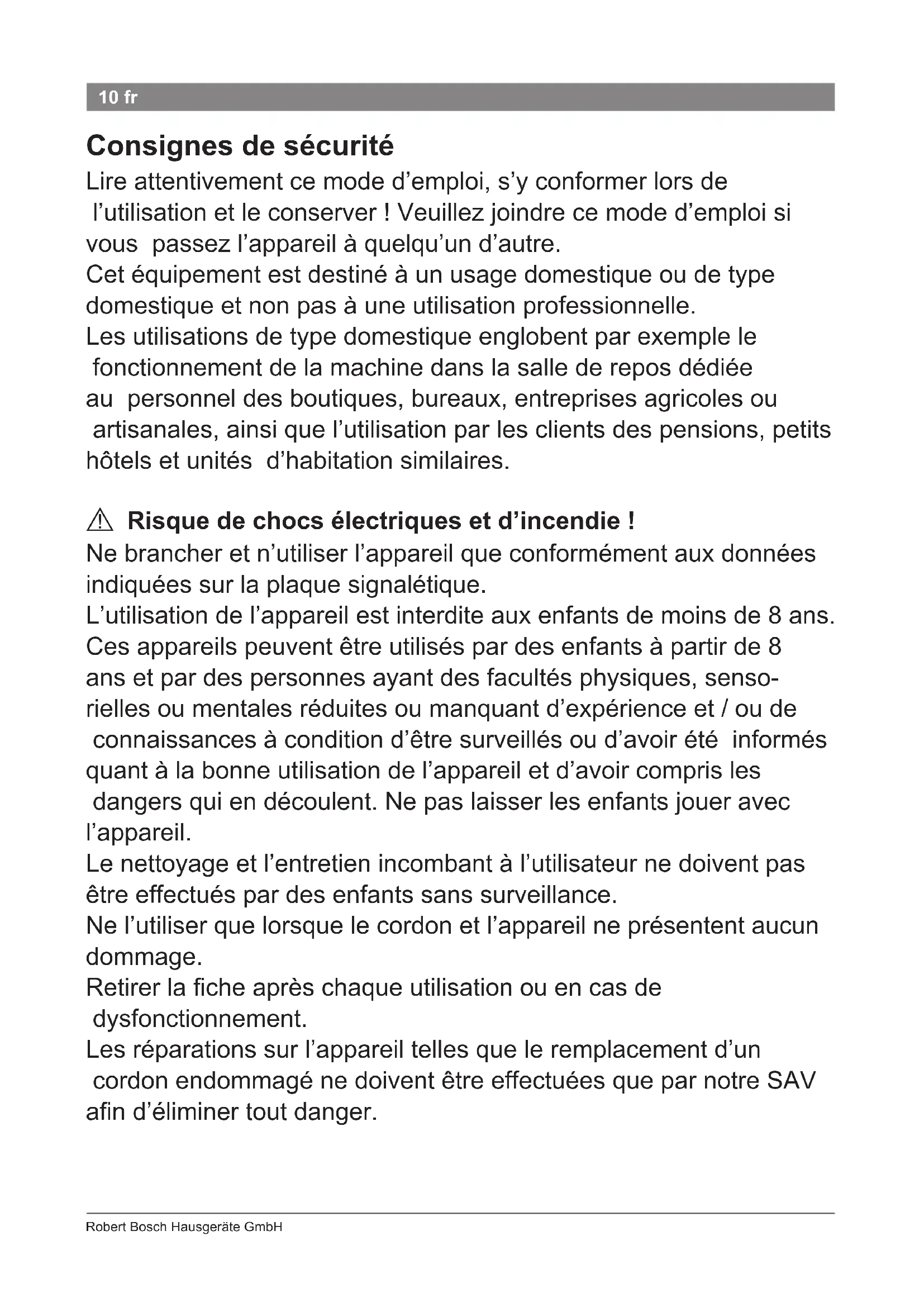 Danger de mort ! Nejamaismettrel’appareilaucontactdel’eau.Ilyaégalement risquelorsquel’appareilestéteint.C’estlaraisonpourlaquelle, aprèsutilisationoulorsd’uneinterruptiond’utilisation,ilfautretirer lache. L’installationd’uninterrupteurdeprotectioncontrelescourants decourt-circuitjusqu’à30mAdanslamaisonoffreuneprotection supplémentaire.Sefaireconseillerparunmonteurendispositifs électriques.