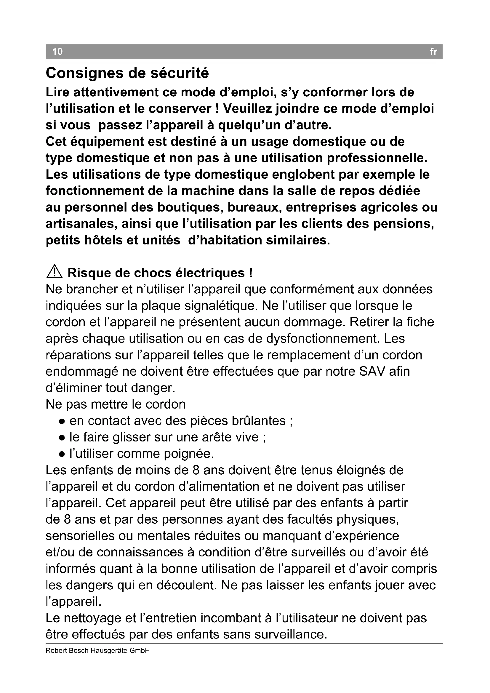 Risque de chocs électriques ! Ne brancher et n’utiliser l’appareil que conformément aux données indiquées sur la plaque signalétique. Ne l’utiliser que lorsque le cordon et l’appareil ne présentent aucun dommage. Retirer la che après chaque utilisation ou en cas de dysfonctionnement. Les réparations sur l’appareil telles que le remplacement d’un cordon endommagé ne doivent être effectuées que par notre SAV an d’éliminer tout danger. Ne pas mettre le cordon ● en contact avec des pièces brûlantes ; ● le faire glisser sur une arête vive ; ● l’utiliser comme poignée. Les enfants de moins de 8 ans doivent être tenus éloignés de l’appareil et du cordon d’alimentation et ne doivent pas utiliser l’appareil. Cet appareil peut être utilisé par des enfants à partir de 8 ans et par des personnes ayant des facultés physiques, sensorielles ou mentales réduites ou manquant d’expérience et/ou de connaissances à condition d’être surveillés ou d’avoir été informés quant à la bonne utilisation de l’appareil et d’avoir compris les dangers qui en découlent. Ne pas laisser les enfants jouer avec l’appareil. Le nettoyage et l’entretien incombant à l’utilisateur ne doivent pas être effectués par des enfants sans surveillance.11 TAT 3A.. 06/2013