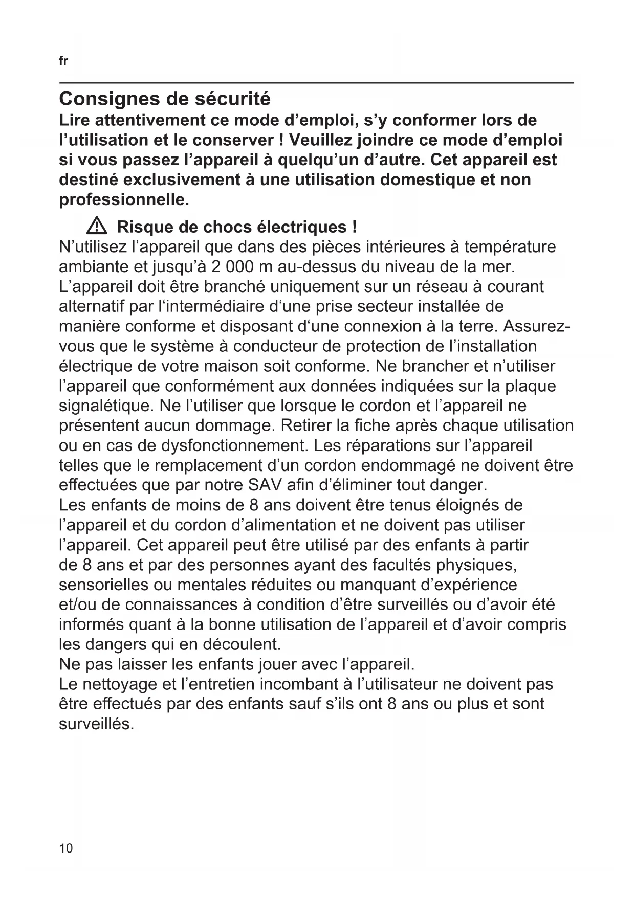 Consignes de sécurité Lire attentivement ce mode d’emploi, s’y conformer lors de l’utilisation et le conserver ! Veuillez joindre ce mode d’emploi si vous passez l’appareil à quelqu’un d’autre. Cet appareil est destiné exclusivement à une utilisation domestique et non professionnelle. W Risque de chocs électriques ! N’utilisez l’appareil que dans des pièces intérieures à température ambiante et jusqu’à 2 000 m au-dessus du niveau de la mer. L’appareil doit être branché uniquement sur un réseau à courant alternatif par l‘intermédiaire d‘une prise secteur installée de manière conforme et disposant d‘une connexion à la terre. Assurez- vous que le système à conducteur de protection de l’installation électrique de votre maison soit conforme. Ne brancher et n’utiliser l’appareil que conformément aux données indiquées sur la plaque signalétique. Ne l’utiliser que lorsque le cordon et l’appareil ne présentent aucun dommage. Retirer la che après chaque utilisation ou en cas de dysfonctionnement. Les réparations sur l’appareil telles que le remplacement d’un cordon endommagé ne doivent être eectuées que par notre SAV an d’éliminer tout danger. Les enfants de moins de 8 ans doivent être tenus éloignés de l’appareil et du cordon d’alimentation et ne doivent pas utiliser l’appareil. Cet appareil peut être utilisé par des enfants à partir de 8 ans et par des personnes ayant des facultés physiques, sensorielles ou mentales réduites ou manquant d’expérience et/ou de connaissances à condition d’être surveillés ou d’avoir été informés quant à la bonne utilisation de l’appareil et d’avoir compris les dangers qui en découlent. Ne pas laisser les enfants jouer avec l’appareil. Le nettoyage et l’entretien incombant à l’utilisateur ne doivent pas être eectués par des enfants sauf s’ils ont 8 ans ou plus et sont surveillés.11