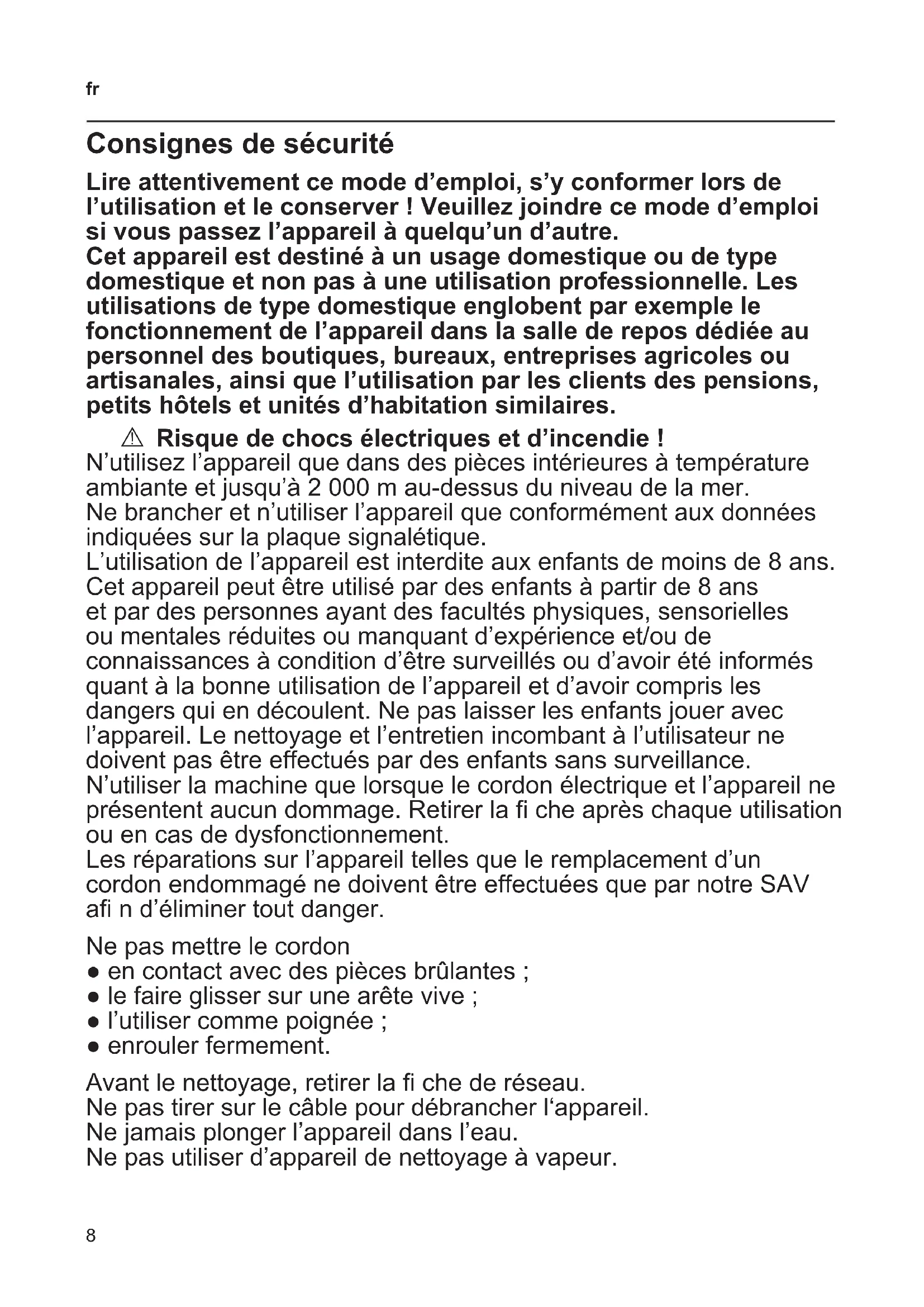 Consignes de sécurité Lire attentivement ce mode d’emploi, s’y conformer lors de l’utilisation et le conserver ! Veuillez joindre ce mode d’emploi si vous passez l’appareil à quelqu’un d’autre. Cet appareil est destiné à un usage domestique ou de type domestique et non pas à une utilisation professionnelle. Les utilisations de type domestique englobent par exemple le fonctionnement de l’appareil dans la salle de repos dédiée au personnel des boutiques, bureaux, entreprises agricoles ou artisanales, ainsi que l’utilisation par les clients des pensions, petits hôtels et unités d’habitation similaires. A Risque de chocs électriques et d’incendie ! N’utilisez l’appareil que dans des pièces intérieures à température ambiante et jusqu’à 2 000 m au-dessus du niveau de la mer. Ne brancher et n’utiliser l’appareil que conformément aux données indiquées sur la plaque signalétique. L’utilisation de l’appareil est interdite aux enfants de moins de 8 ans. Cet appareil peut être utilisé par des enfants à partir de 8 ans et par des personnes ayant des facultés physiques, sensorielles ou mentales réduites ou manquant d’expérience et/ou de connaissances à condition d’être surveillés ou d’avoir été informés quant à la bonne utilisation de l’appareil et d’avoir compris les dangers qui en découlent. Ne pas laisser les enfants jouer avec l’appareil. Le nettoyage et l’entretien incombant à l’utilisateur ne doivent pas être effectués par des enfants sans surveillance. N’utiliser la machine que lorsque le cordon électrique et l’appareil ne présentent aucun dommage. Retirer la che après chaque utilisation ou en cas de dysfonctionnement. Les réparations sur l’appareil telles que le remplacement d’un cordon endommagé ne doivent être effectuées que par notre SAV a n d’éliminer tout danger. Ne pas mettre le cordon ● en contact avec des pièces brûlantes ; ● le faire glisser sur une arête vive ; ● l’utiliser comme poignée ; ● enrouler fermement. Avant le nettoyage, retirer la che de réseau. Ne pas tirer sur le câble pour débrancher l‘appareil. Ne jamais plonger l’appareil dans l’eau. Ne pas utiliser d’appareil de nettoyage à vapeur.9