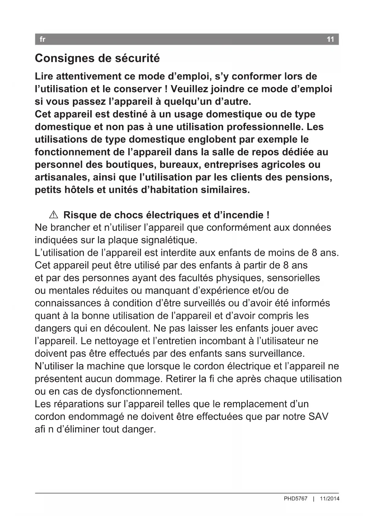 Ne pas utiliser à proximité des baignoires, des lavabos ou autres récipients contenant de l’eau. A Danger de mort ! Ne jamais mettre l’appareil au contact de l’eau. Il y a également risque lorsque l’appareil est éteint. C’est la raison pour laquelle, après utilisation ou lors d’une interruption d’utilisation, il faut retirer la che. L’installation d’un interrupteur de protection contre les courants de court-circuit jusqu’à 30 mA dans la maison offre une protection supplémentaire. Se faire conseiller par un monteur en dispositifs électriques. A Risque d’étouffement ! Ne pas laisser les enfants jouer avec les emballages. A Risque de brûlure ! La buse pour le styling et le diffuseur peuvent devenir très chauds. Laissez-les refroidir avant de les retirer.13 PHD5767 | 11/2014