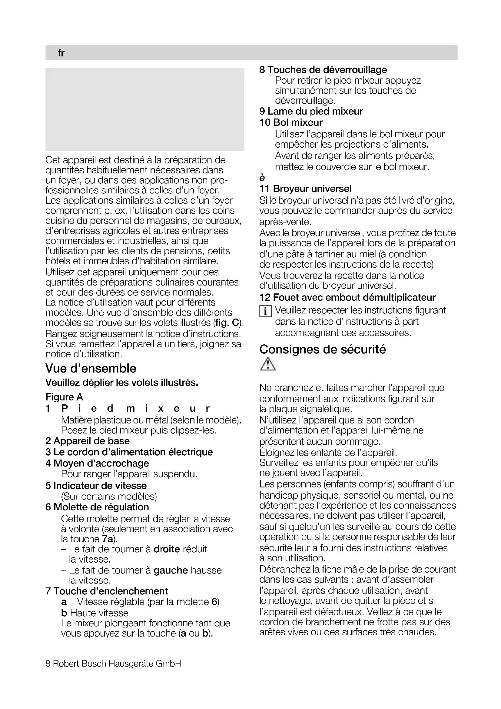 s çìë=îÉ åÉò=ÇÛ~ÅÜÉíÉ ê=ÅÉ=åçìîÉä=~éé~êÉ áä= _lp`e=Éí=åçìë=îçìë=Éå=ѨäáÅáíçåë= ÅçêÇá~äÉãÉåíK s çìë=îÉåÉò= ~áåëá=ÇÛçéíÉê=éçìê=ìå=~é é~êÉáä= ¨äÉÅíêçã¨å~ÖÉê=ãçÇÉêåÉ=Éí=ÇÉ=Ü~ìíÉ= èì~äáí¨K=pìê=åçíêÉ =ëáíÉ=t ÉÄI=îçìë=íêçìîÉêÉò= ÇÉë= áåÑçêã ~íáçå ë= ~î~åÅ ¨Éë= ë ìê= åçë= éêçÇì áíëKRobert Bosch Hausgeräte GmbH 9 Afin d’écarter tout danger, seul le fabricant ou son service après-vente ou une personne détenant une qualification équivalente est habilité à remplacer un cordon de branchement endommagé. Les réparations sur l’appareil sont réservées à notre service après-vente. N’utilisez pas le mixeur plongeant avec les mains mouillées et ne le faites pas tourner à vide. N’utilisez le mixeur plongeant qu’équipé de ses accessoires d’origine. Prudence lors du traitement de liquides très chauds. L’appareil risque de provoquer des projection de liquide. Lorsque vous plongez le mixeur dans un liquide, veillez à ce que le niveau de liquide ne monte pas au-dessus de la jonction entre le pied mixeur et l’appareil de base. Ne laissez jamais l’appareil allumé plus longtemps que nécessaire au mixage des produits alimentaires à traiter. Ne posez jamais le pied mixeur sur des surfaces très chaudes, ne l’utilisez jamais dans des produits à mélanger très chauds. Avant de plonger le pied mixeur dans des produits très chauds, attendez qu’ils soient revenus à moins de 80 °C ! oáëèìÉ=ÇÉ=ÄäÉëëìêÉ=~îÉÅ=äÉë=ä~ãÉë= íê~åÅÜ~åíÉë=Çì=ãáñÉìêLäÛÉåíê~≤åÉãÉåí= Éå=êçí~íáçå kÛ~ééêçÅÜÉò=à~ã~áë=äÉë=ÇçáÖíë=Çì=ÅçìíÉ~ì= éê¨ëÉåí=Ç~åë=äÉ=éáÉÇ=ãáñÉìêK=kÉ=åÉííçóÉò= à~ã~áë=¶= ã~áåë=åìÉë=ä~=ä~ãÉ=Çì =é á ÉÇ=ãáñÉìêK= ríáäáëÉò=ìåÉ=ÄêçëëÉK fãéçêí~åí=> kÉ=éçëÉò=äÉ=éáÉÇ=ãáñÉìê=Ç~åë=ìå=ê¨ÅáéáÉåí= Éí åÉ=äÛÉå=êÉíáêÉò=èìÛ~éê≠ë=èìÉ=äÉ=ãçíÉìê= Çì ãáñÉìê=éäçåÖÉ~åí=~=ÅÉëë¨=ÇÉ=íçìêåÉêK Utilisation Pour mélanger les mayonnaises, sauces, bois- sons, aliments pour bébé, fruits et légumes cuits. Pour réduire les soupes en purée. Pour broyer/hacher les produits alimentaires crus (oignons, ail, herbe culinaires), utilisez le broyeur universel ! Ce mixeur plongeant ne convient pas pour préparer de la purée de pommes de terre. Nettoyez toutes les pièces avant la première utilisation. Figure B Déroulez complètement le cordon d'alimentation électrique. Posez le pied mixeur sur l’appareil de base puis clipsez-les. Branchez la fiche mâle dans la prise de courant. Versez les aliments dans un bol mixeur ou dans un autre récipient à bords hauts. Le mixeur plongeant fonctionne mieux si les produits alimentaires à traiter se trouvent dans du liquide. Réglez la vitesse au moyen du régulateur de vitesse. – Le fait de tourner à droite réduit la vitesse. – Le fait de tourner à gauche hausse la vitesse.