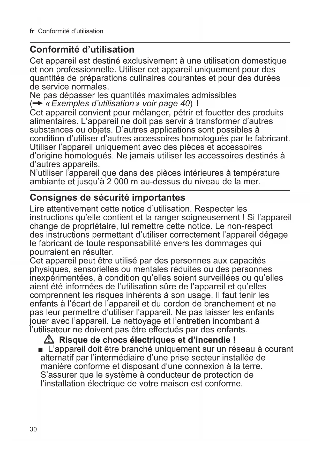Optional accessories MUZ45RS1 Grating disc coarse For the continuousfeed shredder MUZ5DS1. For grating raw potatoes, e.g. for potato pancakes or dumplings. MUZ45KP1 Potato fritter disc For the continuousfeed shredder MUZ5DS1. For grating raw potatoes for rostis and potato fritters, for cutting fruit and vegetables into thick slices. MUZ5ER2 Stainless steel stirring bowl Up to 750 g of our plus ingredients can be processed in the bowl. MUZ5KR1 Plastic mixing bowl Up to 750 g of our plus ingredients can be processed in the bowl. MUZ5MX1 Plastic blender attachment For blending drinks, for pureeing fruit and vegetables, for preparing mayonnaise, for cutting fruit, nuts, for crushing ice cubes. MUZ5MM1 Multimixer For chopping herbs, vegetables, apples and meat, for shredding carrots, radishes and cheese, for grating nuts and cooled chocolate. If an accessory is not included in the product package, it can be purchased via the trade or from customer service.30 fr Conformité d’utilisation Conformité d’utilisation Cet appareil est destiné exclusivement à une utilisation domestique et non professionnelle. Utiliser cet appareil uniquement pour des quantités de préparations culinaires courantes et pour des durées de service normales. Ne pas dépasser les quantités maximales admissibles (X « Exemples d’utilisation » voir page 40) ! Cet appareil convient pour mélanger, pétrir et fouetter des produits alimentaires. L’appareil ne doit pas servir à transformer d’autres substances ou objets. D’autres applications sont possibles à condition d’utiliser d’autres accessoires homologués par le fabricant. Utiliser l’appareil uniquement avec des pièces et accessoires d’origine homologués. Ne jamais utiliser les accessoires destinés à d’autres appareils. N’utiliser l’appareil que dans des pièces intérieures à température ambiante et jusqu’à 2 000 m audessus du niveau de la mer. Consignes de sécurité importantes Lire attentivement cette notice d’utilisation. Respecter les instructions qu’elle contient et la ranger soigneusement ! Si l’appareil change de propriétaire, lui remettre cette notice. Le nonrespect des instructions permettant d’utiliser correctement l’appareil dégage le fabricant de toute responsabilité envers les dommages qui pourraient en résulter. Cet appareil peut être utilisé par des personnes aux capacités physiques, sensorielles ou mentales réduites ou des personnes inexpérimentées, à condition qu’elles soient surveillées ou qu’elles aient été informées de l’utilisation sûre de l’appareil et qu’elles comprennent les risques inhérents à son usage. Il faut tenir les enfants à l’écart de l’appareil et du cordon de branchement et ne pas leur permettre d’utiliser l’appareil. Ne pas laisser les enfants jouer avec l’appareil. Le nettoyage et l’entretien incombant à l’utilisateur ne doivent pas être eectués par des enfants. W Risque de chocs électriques et d’incendie ! ■ L’appareil doit être branché uniquement sur un réseau à courant alternatif par l’intermédiaire d’une prise secteur installée de manière conforme et disposant d’une connexion à la terre. S’assurer que le système à conducteur de protection de l’installation électrique de votre maison est conforme.31