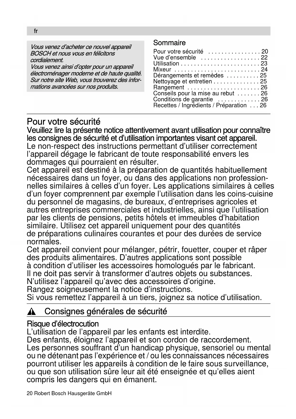 - Recettes / Ingrédients / Préparation Pour votre sécurité Veuillez lire la présente notice attentivement avant utilisation pour connaître les consignes de sécurité et d’utilisation importantes visant cet appareil. Le non-respect des instructions permettant d’utiliser correctement l’appareil dégage le fabricant de toute responsabilité envers les dommages qui pourraient en résulter. Cet appareil est destiné à la préparation de quantités habituellement nécessaires dans un foyer, ou dans des applications non profession- nelles similaires à celles d’un foyer. Les applications similaires à celles d’un foyer comprennent par exemple l’utilisation dans les coins-cuisine du personnel de magasins, de bureaux, d’entreprises agricoles et autres entreprises commerciales et industrielles, ainsi que l’utilisation par les clients de pensions, petits hôtels et immeubles d’habitation similaire. Utilisez cet appareil uniquement pour des quantités de préparations culinaires courantes et pour des durées de service normales. Cet appareil convient pour mélanger, pétrir, fouetter, couper et râper des produits alimentaires. D’autres applications sont possible à condition d’utiliser les accessoires homologués par le fabricant. Il ne doit pas servir à transformer d’autres objets ou substances. N’utilisez l’appareil qu’avec des accessoires d’origine. Rangez soigneusement la notice d’instructions. Si vous remettez l’appareil à un tiers, joignez sa notice d’utilisation. , Consignes générales de sécurité Risque d’électrocution L’utilisation de l’appareil par les enfants est interdite. Des enfants, éloignez l’appareil et son cordon de raccordement. Les personnes souffrant d’un handicap physique, sensoriel ou mental ou ne détenant pas l’expérience et / ou les connaissances nécessaires pourront utiliser les appareils à condition de le faire sous surveillance, ou que son utilisation sûre leur ait été enseignée et qu’elles aient compris les dangers qui en émanent. p. 26