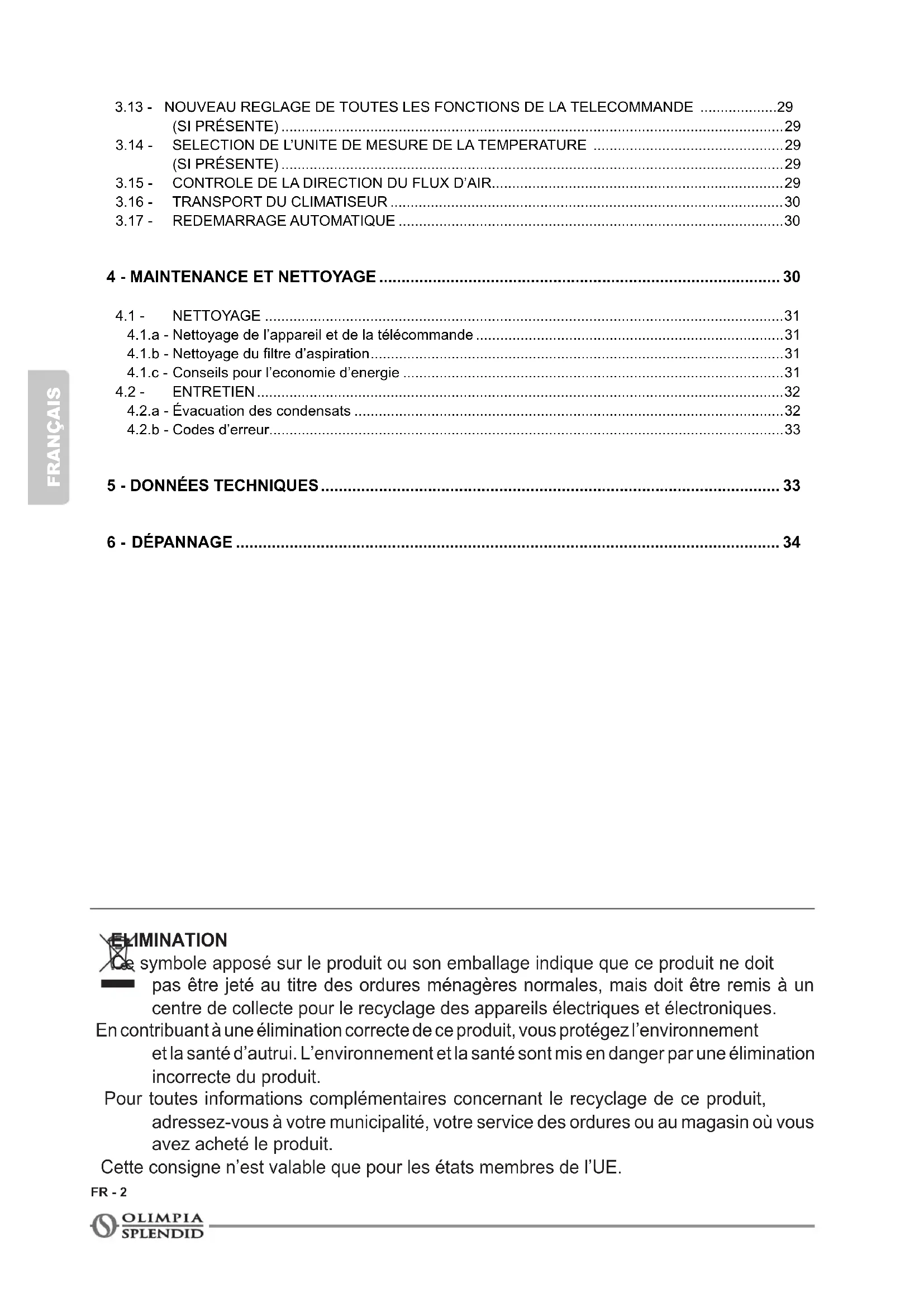 3.12.d - Reglage du temporisateur d’extinction sur le panneau de commande .......................................29FRANÇAIS FR - 2 ELIMINATION Ce symbole apposé sur le produit ou son emballage indique que ce produit ne doit pas être jeté au titre des ordures ménagères normales, mais doit être remis à un centre de collecte pour le recyclage des appareils électriques et électroniques. En contribuant à une élimination correcte de ce produit, vous protégez l’environnement et la santé d’autrui. L’environnement et la santé sont mis en danger par une élimination incorrecte du produit. Pour toutes informations complémentaires concernant le recyclage de ce produit, adressez-vous à votre municipalité, votre service des ordures ou au magasin où vous avez acheté le produit. Cette consigne n’est valable que pour les états membres de l’UE.