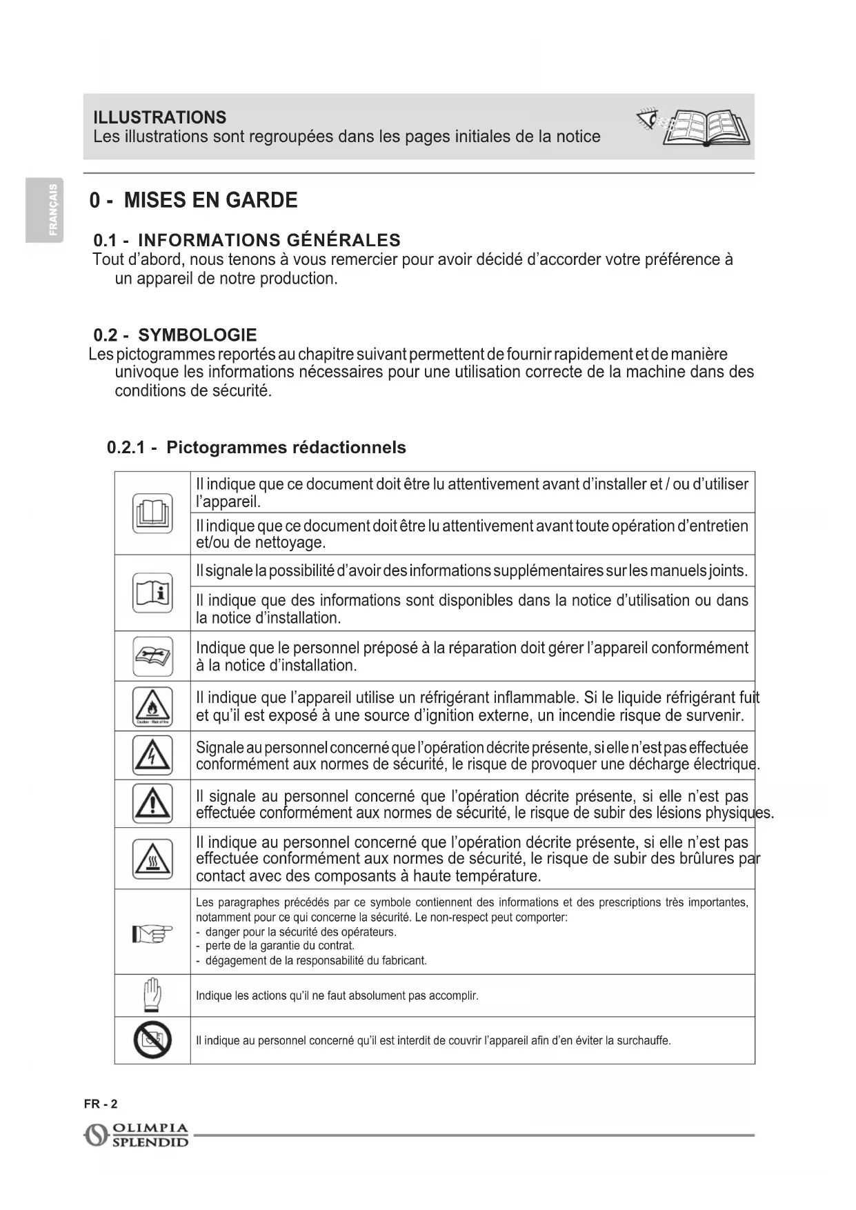 Il indique que ce document doit être lu attentivement avant d’installer et / ou d’utiliser l’appareil. Il indique que ce document doit être lu attentivement avant toute opération d’entretien et/ou de nettoyage. Il signale la possibilité d’avoir des informations supplémentaires sur les manuels joints. Il indique que des informations sont disponibles dans la notice d’utilisation ou dans la notice d’installation. Indique que le personnel préposé à la réparation doit gérer l’appareil conformément à la notice d’installation. Il indique que l’appareil utilise un réfrigérant inammable. Si le liquide réfrigérant fuit et qu’il est exposé à une source d’ignition externe, un incendie risque de survenir. Signale au personnel concerné que l’opération décrite présente, si elle n’est pas effectuée conformément aux normes de sécurité, le risque de provoquer une décharge électrique. Il signale au personnel concerné que l’opération décrite présente, si elle n’est pas effectuée conformément aux normes de sécurité, le risque de subir des lésions physiques. Il indique au personnel concerné que l’opération décrite présente, si elle n’est pas effectuée conformément aux normes de sécurité, le risque de subir des brûlures par contact avec des composants à haute température. Les paragraphes précédés par ce symbole contiennent des informations et des prescriptions très importantes, notamment pour ce qui concerne la sécurité. Le non-respect peut comporter:- danger pour la sécurité des opérateurs.- perte de la garantie du contrat.- dégagement de la responsabilité du fabricant.Indique les actions qu’il ne faut absolument pas accomplir.Il indique au personnel concerné qu’il est interdit de couvrir l’appareil an d’en éviter la surchauffe. ILLUSTRATIONS Les illustrations sont regroupées dans les pages initiales de la noticeDOLCECLIMA AIR PRO FR - 3 FRANÇAIS