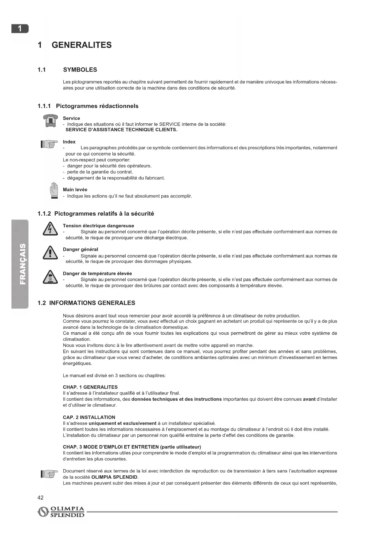 Nous désirons avant tout vous remercier pour avoir accordé la préférence à un climatiseur de notre production. Comme vous pourrez le constater, vous avez effectué un choix gagnant en achetant un produit qui représente ce qu’il y a de plus avancé dans la technologie de la climatisation domestique. Ce manuel a été conçu an de vous fournir toutes les explications qui vous permettront de gérer au mieux votre système de climatisation. Nous vous invitons donc à le lire attentivement avant de mettre votre appareil en marche. En suivant les instructions qui sont contenues dans ce manuel, vous pourrez proter pendant des années et sans problèmes, grâce au climatiseur que vous venez d’acheter, de conditions ambiantes optimales avec un minimum d’investissement en termes énergétiques. Le manuel est divisé en 3 sections ou chapitres: CHAP. 1 GENERALITES Il s’adresse à l’installateur qualié et à l’utilisateur nal. Il contient des informations, des données techniques et des instructions importantes qui doivent être connues avant d’installer et d’utiliser le climatiseur. CAP. 2 INSTALLATION Il s’adresse uniquement et exclusivement à un installateur spécialisé. Il contient toutes les informations nécessaires à l’emplacement et au montage du climatiseur à l’endroit où il doit être installé. L’installation du climatiseur par un personnel non qualié entraîne la perte d’effet des conditions de garantie. CHAP. 3 MODE D’EMPLOI ET ENTRETIEN (partie utilisateur) Il contient les informations utiles pour comprendre le mode d’emploi et la programmation du climatiseur ainsi que les interventions d’entretien les plus courantes. Document réservé aux termes de la loi avec interdiction de reproduction ou de transmission à tiers sans l’autorisation expresse de la société OLIMPIA SPLENDID. Les machines peuvent subir des mises à jour et par conséquent présenter des éléments différents de ceux qui sont représentés,