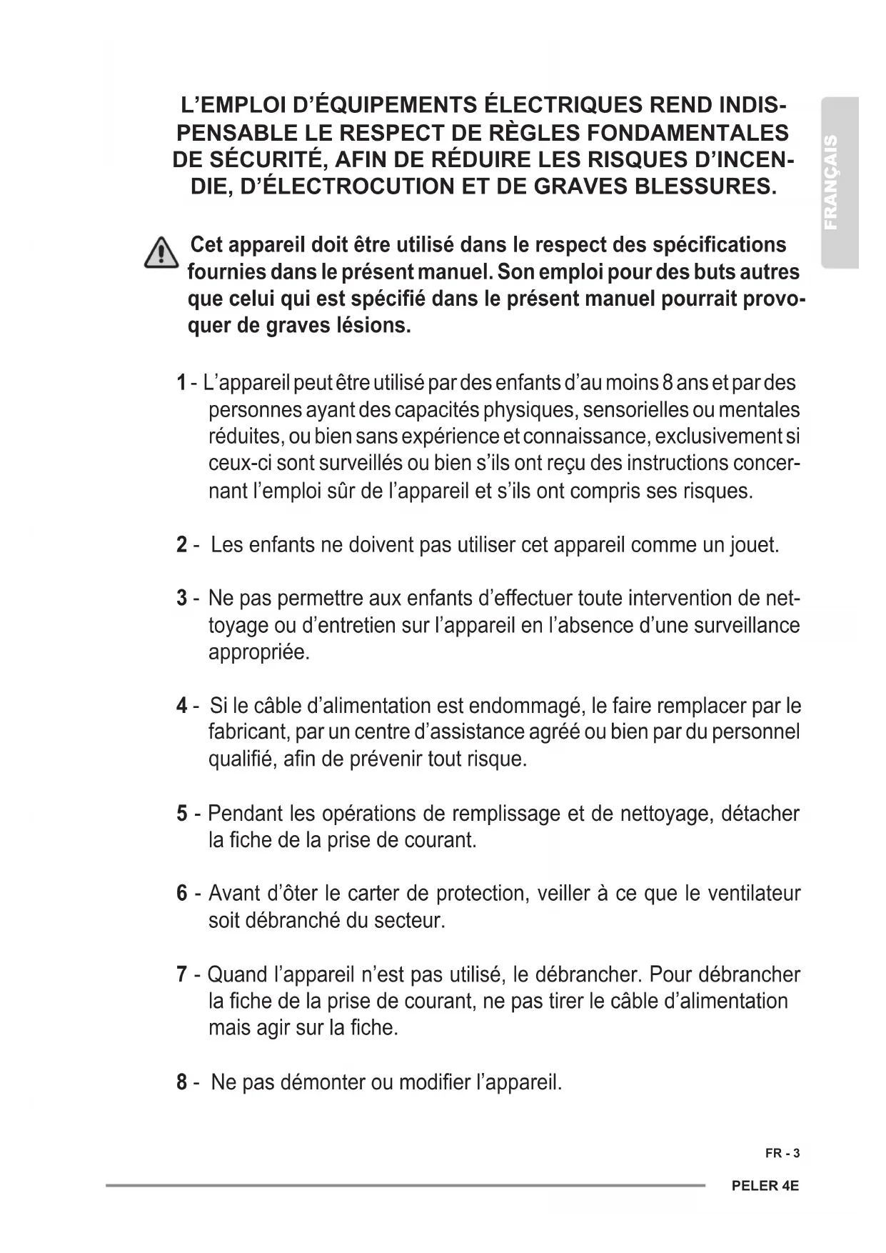 PRODUCT DIMENSION (W×H×D) 240mm x 610mm x 300mmPELER 4E FRANÇAIS FR - 3 L’EMPLOI D’ÉQUIPEMENTS ÉLECTRIQUES REND INDIS- PENSABLE LE RESPECT DE RÈGLES FONDAMENTALES DE SÉCURITÉ, AFIN DE RÉDUIRE LES RISQUES D’INCEN- DIE, D’ÉLECTROCUTION ET DE GRAVES BLESSURES. Cet appareil doit être utilisé dans le respect des spécications fournies dans le présent manuel. Son emploi pour des buts autres que celui qui est spécié dans le présent manuel pourrait provo- quer de graves lésions.