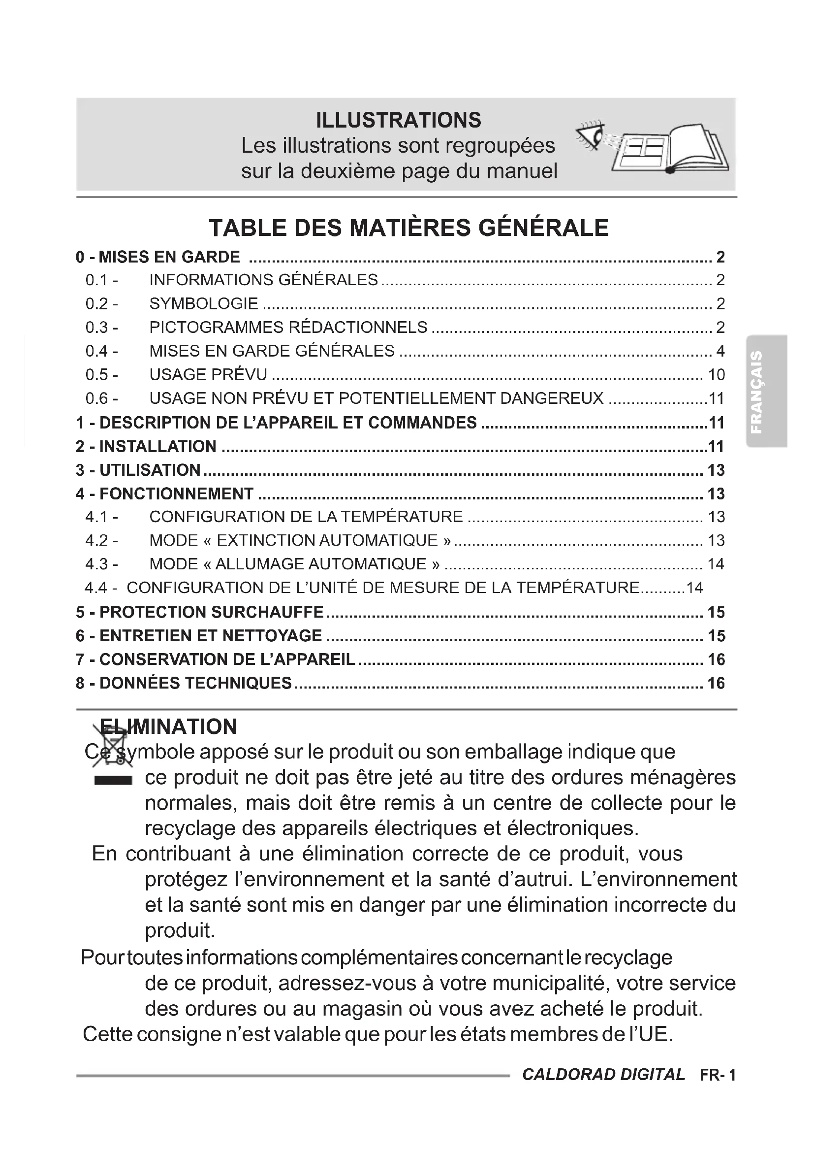 ILLUSTRATIONS Les illustrations sont regroupées sur la deuxième page du manuel ELIMINATION Ce symbole apposé sur le produit ou son emballage indique que ce produit ne doit pas être jeté au titre des ordures ménagères normales, mais doit être remis à un centre de collecte pour le recyclage des appareils électriques et électroniques. En contribuant à une élimination correcte de ce produit, vous protégez l’environnement et la santé d’autrui. L’environnement et la santé sont mis en danger par une élimination incorrecte du produit. Pour toutes informations complémentaires concernant le recyclage de ce produit, adressez-vous à votre municipalité, votre service des ordures ou au magasin où vous avez acheté le produit. Cette consigne n’est valable que pour les états membres de l’UE.FRANÇAIS FR- 2