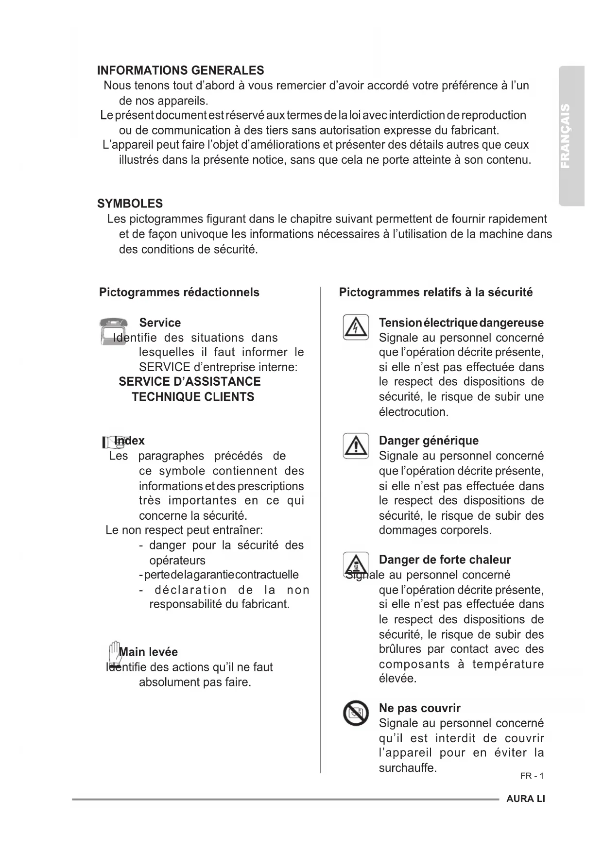 a. Theappliancedoesn’tworkwhenpressingthepowerbutton. -Theplugisnotcorrectlyinsertedinthepowersocket. -Thepowersocketdoesn’twork. b. Theapplianceisparticularlynoisy. -Theapplianceisnotpositionedcorrectlyonthesupportingsurface. -Thesupportingsurfaceisnotstable. -Thefrontpanel(1)isnotcorrectlyhookedtotheappliancebody(6). c. Theoutgoingairowisparticularlyweak. -Theltersaredirty. -There’snospaceonthesidesoftheappliance(minimum20cm). -Theairsuctiongrid(6a)isdirtyorpartiallyblocked. -Theairoutletgrid(9)isdirtyorpartiallyblocked. d. Evenafteracertainuseoftheappliance,airqualitydoesn’timprove. -Theltersaredirty. e. Functioningtimesignallingledsareashing. -Thefrontpanel(1)isnotcorrectlyhookedtotheappliancebody(6).AURA LI FRANÇAIS FR - 1 INFORMATIONS GENERALES Nous tenons tout d’abord à vous remercier d’avoir accordé votre préférence à l’un de nos appareils. Le présent document est réservé aux termes de la loi avec interdiction de reproduction ou de communication à des tiers sans autorisation expresse du fabricant. L’appareil peut faire l’objet d’améliorations et présenter des détails autres que ceux illustrés dans la présente notice, sans que cela ne porte atteinte à son contenu. SYMBOLES Lespictogrammesgurantdanslechapitresuivantpermettentdefournirrapidement etdefaçonunivoquelesinformationsnécessairesàl’utilisationdelamachinedans des conditions de sécurité. Pictogrammes rédactionnels Service Identifie des situations dans lesquelles il faut informer le SERVICE d’entreprise interne: