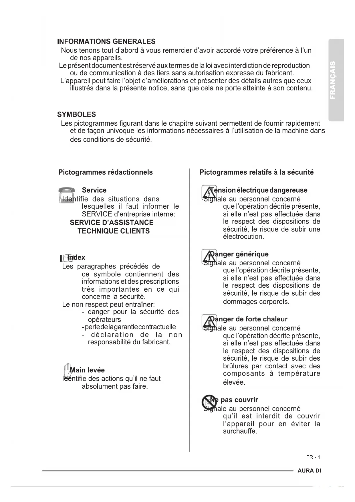 - Lire attentivement le présent manuel avant de procéder à toute opération (installation, entretien, utilisation) et suivre scrupuleusement ce qui est décrit dans chacun des chapitres. Conserver ce livret avec soin pour toute consultation ultérieure.