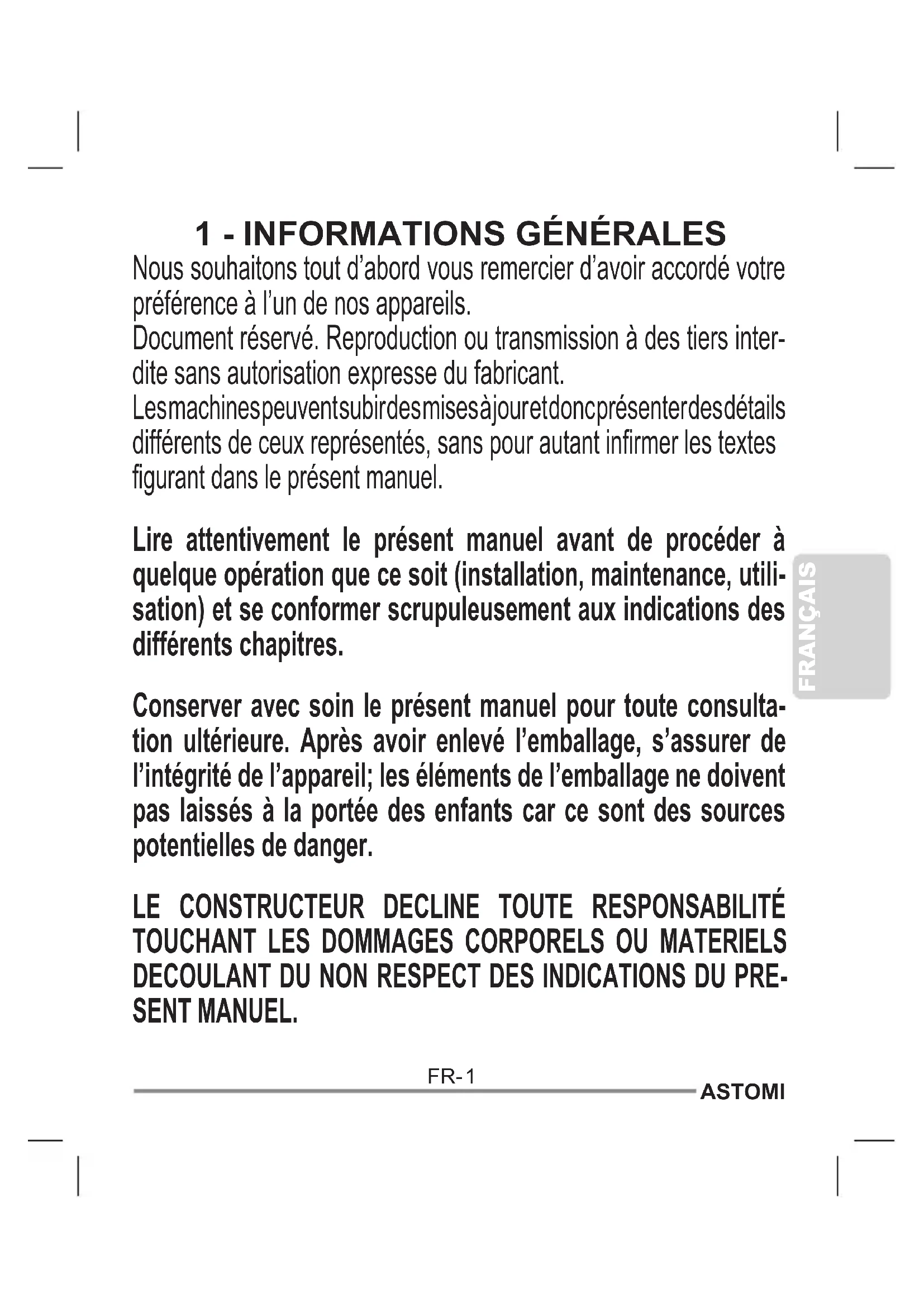 ASTOMIFRANÇAIS FR- Le constructeur se réserve le droit d’apporter des modica- tions à tout moment à ses modèles, sous réserve des caracté- ristiques essentielles décrites dans le présent manuel.