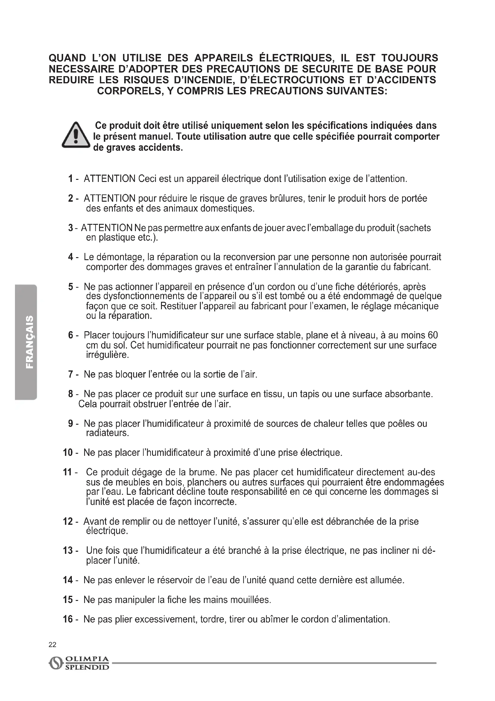 10 - Ne pas placer l’humidicateur à proximité d’une prise électrique.