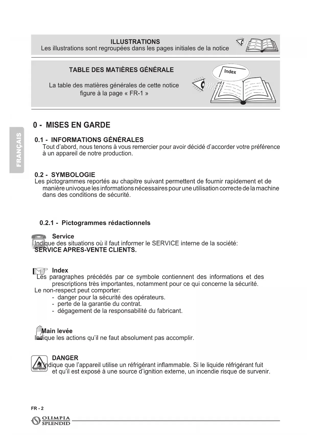 Service Indique des situations où il faut informer le SERVICE interne de la société: SERVICE APRES-VENTE CLIENTS. Index Les paragraphes précédés par ce symbole contiennent des informations et des prescriptions très importantes, notamment pour ce qui concerne la sécurité. Le non-respect peut comporter: - danger pour la sécurité des opérateurs. - perte de la garantie du contrat. - dégagement de la responsabilité du fabricant. Main levée Indique les actions qu’il ne faut absolument pas accomplir. DANGER Ilindiquequel’appareilutiliseunréfrigérantinammable.Sileliquideréfrigérantfuit et qu’il est exposé à une source d’ignition externe, un incendie risque de survenir. TABLE DES MATIÈRES GÉNÉRALE La table des matières générales de cette notice gureàlapage«FR-1» ILLUSTRATIONS Les illustrations sont regroupées dans les pages initiales de la notice IndexAQUARIA FRANÇAIS FR - 3