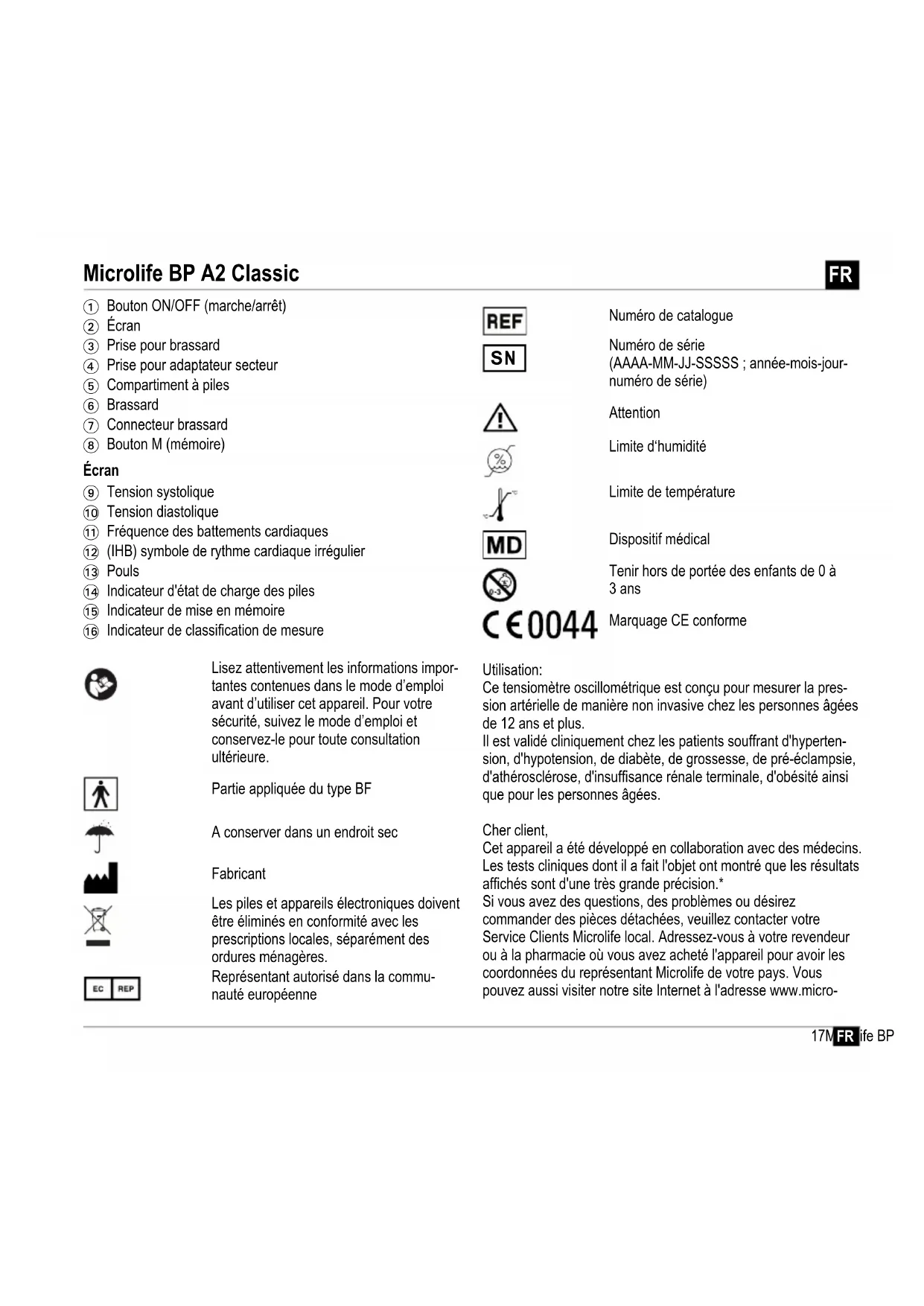 Écran Utilisation: Ce tensiomètre oscillométrique est conçu pour mesurer la pres- sion artérielle de manière non invasive chez les personnes âgées de 12 ans et plus. Il est validé cliniquement chez les patients souffrant d'hyperten- sion, d'hypotension, de diabète, de grossesse, de pré-éclampsie, d'athérosclérose, d'insuffisance rénale terminale, d'obésité ainsi que pour les personnes âgées. Cher client, Cet appareil a été développé en collaboration avec des médecins. Les tests cliniques dont il a fait l'objet ont montré que les résultats affichés sont d'une très grande précision.* Si vous avez des questions, des problèmes ou désirez commander des pièces détachées, veuillez contacter votre Service Clients Microlife local. Adressez-vous à votre revendeur ou à la pharmacie où vous avez acheté l'appareil pour avoir les coordonnées du représentant Microlife de votre pays. Vous pouvez aussi visiter notre site Internet à l'adresse www.micro- Microlife BP A2 Classic