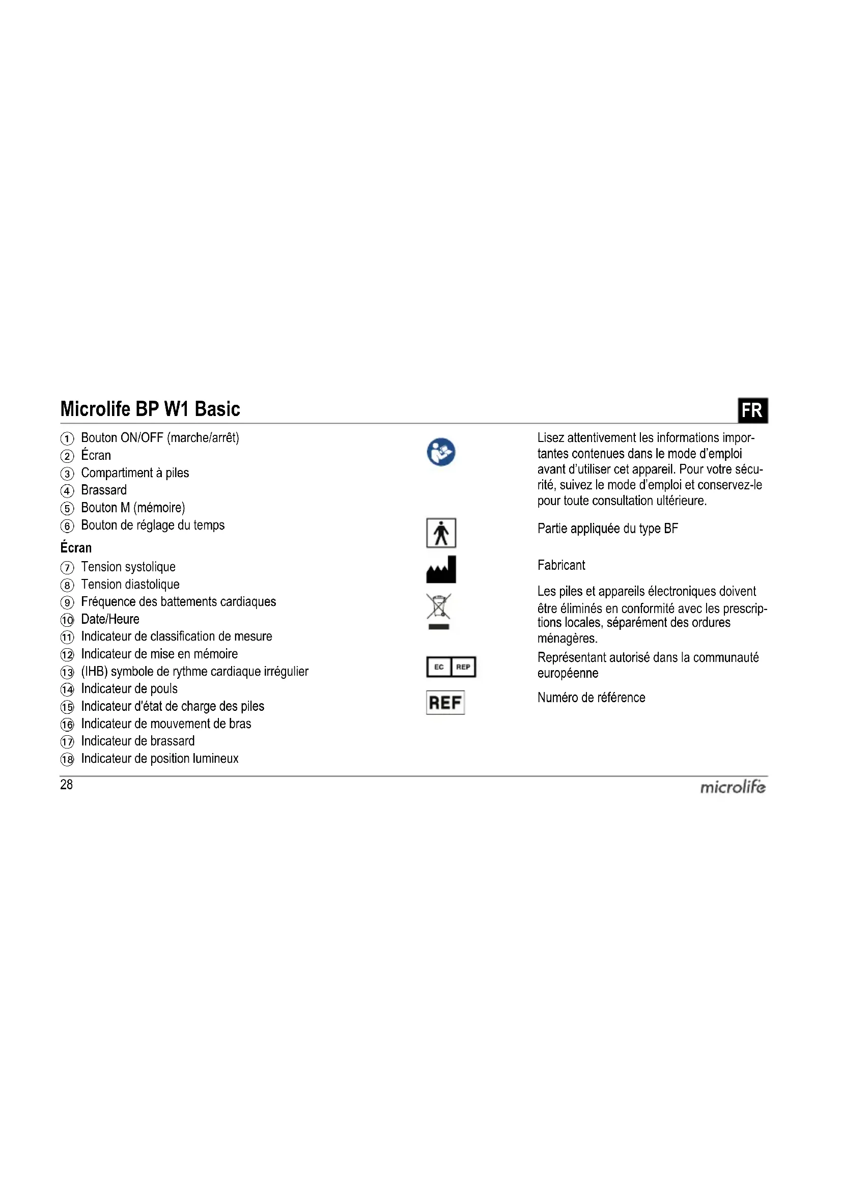 1 Bouton ON/OFF (marche/arrêt) 2 Écran 3 Compartiment à piles 4 Brassard 5 Bouton M (mémoire) 6 Bouton de réglage du temps 7 Tension systolique 8 Tension diastolique 9 Fréquence des battements cardiaques AT Date/Heure AK Indicateur de classification de mesure AL Indicateur de mise en mémoire AM (IHB) symbole de rythme cardiaque irrégulier AN Indicateur de pouls AO Indicateur d'état de charge des piles AP Indicateur de mouvement de bras AQ Indicateur de brassard AR Indicateur de position lumineux Lisez attentivement les informations impor- tantes contenues dans le mode d’emploi avant d’utiliser cet appareil. Pour votre sécu- rité, suivez le mode d’emploi et conservez-le pour toute consultation ultérieure. Partie appliquée du type BF Fabricant Les piles et appareils électroniques doivent être éliminés en conformité avec les prescrip- tions locales, séparément des ordures ménagères. Représentant autorisé dans la communauté européenne Numéro de référence29Microlife BP W1 Basic FR Utilisation: Ce tensiomètre oscillométrique est conçu pour mesurer la pression artérielle de manière non invasive chez les personnes âgées de 12 ans et plus. Cher client, Votre nouveau tensiomètre Microlife est un appareil médical fiable conçu pour prendre la tension au niveau du poignet. Cet appareil a été développé en collaboration avec des médecins. Les tests cliniques dont il a fait l'objet ont montré que les résultats affichés sont caractérisés par une très grande précision.* Si vous avez des questions, des problèmes ou désirez commander des pièces détachées, veuillez contacter votre Service Clients Microlife local. Adressez-vous à votre revendeur ou à la pharmacie où vous avez acheté l'appareil pour avoir les coordonnées du repré- sentant Microlife de votre pays. Vous pouvez aussi visiter notre site Internet à l'adresse www.microlife.com, où vous trouverez de nombreuses et précieuses informations sur nos produits. Restez en bonne santé avec Microlife AG.