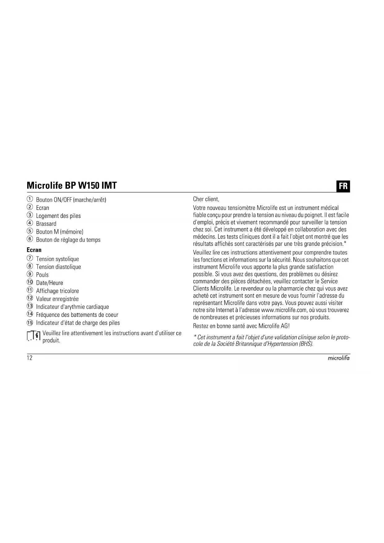 - Cet instrument a fait l'objet d'une validation clinique selon le proto- cole de la Société Britannique d'Hypertension (BHS). Microlife BP W150 IMT