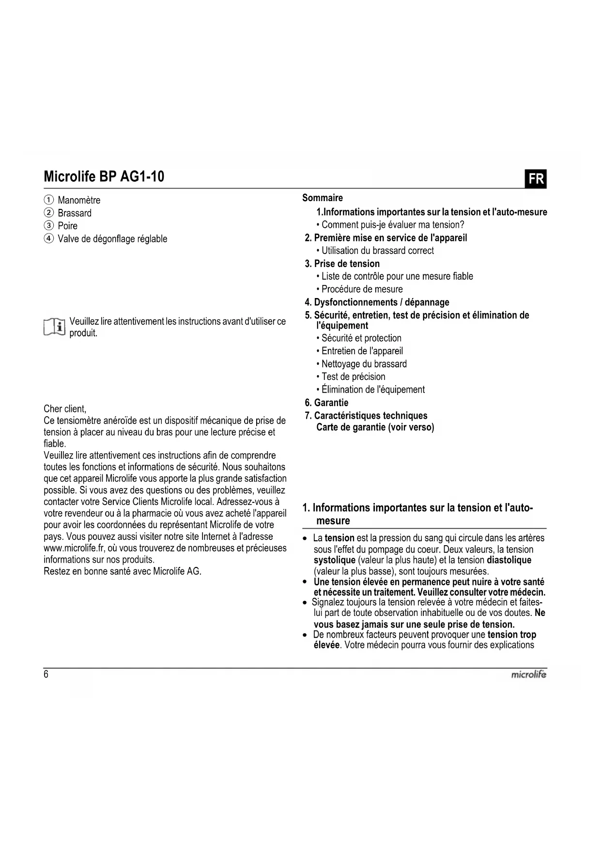 Veuillez lire attentivement les instructions avant d'utiliser ce produit. Cher client, Ce tensiomètre anéroïde est un dispositif mécanique de prise de tension à placer au niveau du bras pour une lecture précise et fiable. Veuillez lire attentivement ces instructions afin de comprendre toutes les fonctions et informations de sécurité. Nous souhaitons que cet appareil Microlife vous apporte la plus grande satisfaction possible. Si vous avez des questions ou des problèmes, veuillez contacter votre Service Clients Microlife local. Adressez-vous à votre revendeur ou à la pharmacie où vous avez acheté l'appareil pour avoir les coordonnées du représentant Microlife de votre pays. Vous pouvez aussi visiter notre site Internet à l'adresse www.microlife.fr, où vous trouverez de nombreuses et précieuses informations sur nos produits. Restez en bonne santé avec Microlife AG. Sommaire 1.Informations importantes sur la tension et l'auto-mesure