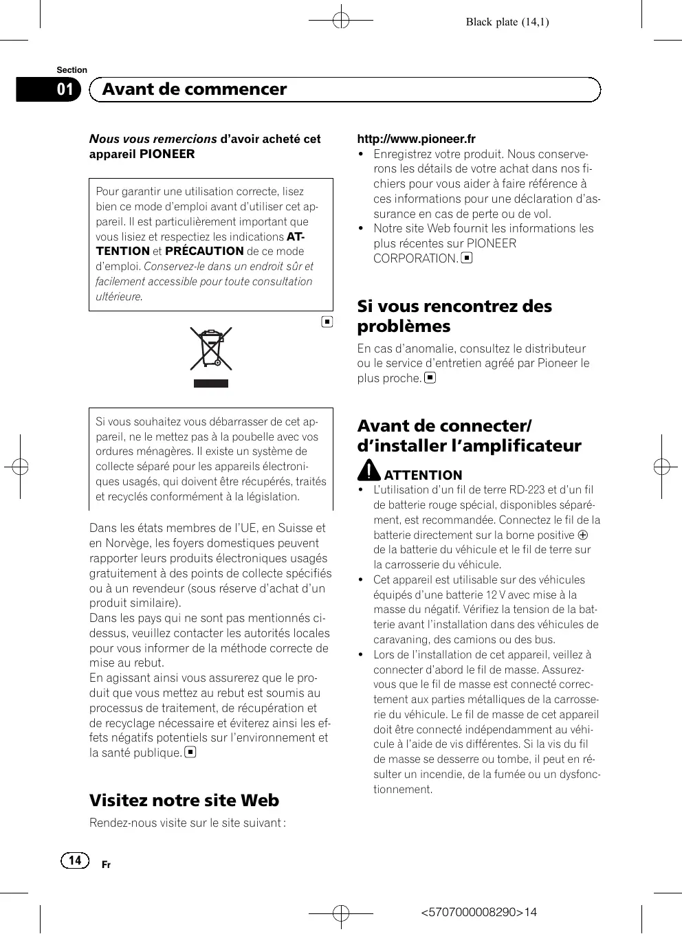 Avant de commencer Nous vous remercions d’avoir acheté cet appareil PIONEER Pour garantir une utilisation correcte, lisez bien ce mode d’emploi avant d’utiliser cet appareil. Il est particulièrement important que vous lisiez et respectiez les indications ATTENTION et PRÉCAUTION de ce mode d’emploi. Conservez-le dans un endroit sûr et facilement accessible pour toute consultation ultérieure. http://www.pioneer.fr ! Enregistrez votre produit. Nous conserverons les détails de votre achat dans nos fichiers pour vous aider à faire référence à ces informations pour une déclaration d’assurance en cas de perte ou de vol. ! Notre site Web fournit les informations les plus récentes sur PIONEER CORPORATION. Si vous rencontrez des problèmes En cas d’anomalie, consultez le distributeur ou le service d’entretien agréé par Pioneer le plus proche. Si vous souhaitez vous débarrasser de cet appareil, ne le mettez pas à la poubelle avec vos ordures ménagères. Il existe un système de collecte séparé pour les appareils électroniques usagés, qui doivent être récupérés, traités et recyclés conformément à la législation. Dans les états membres de l’UE, en Suisse et en Norvège, les foyers domestiques peuvent rapporter leurs produits électroniques usagés gratuitement à des points de collecte spécifiés ou à un revendeur (sous réserve d’achat d’un produit similaire). Dans les pays qui ne sont pas mentionnés cidessus, veuillez contacter les autorités locales pour vous informer de la méthode correcte de mise au rebut. En agissant ainsi vous assurerez que le produit que vous mettez au rebut est soumis au processus de traitement, de récupération et de recyclage nécessaire et éviterez ainsi les effets négatifs potentiels sur l’environnement et la santé publique. Visitez notre site Web Avant de connecter/ d’installer l’amplificateur ATTENTION ! L’utilisation d’un fil de terre RD-223 et d’un fil de batterie rouge spécial, disponibles séparément, est recommandée. Connectez le fil de la batterie directement sur la borne positive + de la batterie du véhicule et le fil de terre sur la carrosserie du véhicule. ! Cet appareil est utilisable sur des véhicules équipés d’une batterie 12 V avec mise à la masse du négatif. Vérifiez la tension de la batterie avant l’installation dans des véhicules de caravaning, des camions ou des bus. ! Lors de l’installation de cet appareil, veillez à connecter d’abord le fil de masse. Assurezvous que le fil de masse est connecté correctement aux parties métalliques de la carrosserie du véhicule. Le fil de masse de cet appareil doit être connecté indépendamment au véhicule à l’aide de vis différentes. Si la vis du fil de masse se desserre ou tombe, il peut en résulter un incendie, de la fumée ou un dysfonctionnement. Rendez-nous visite sur le site suivant :