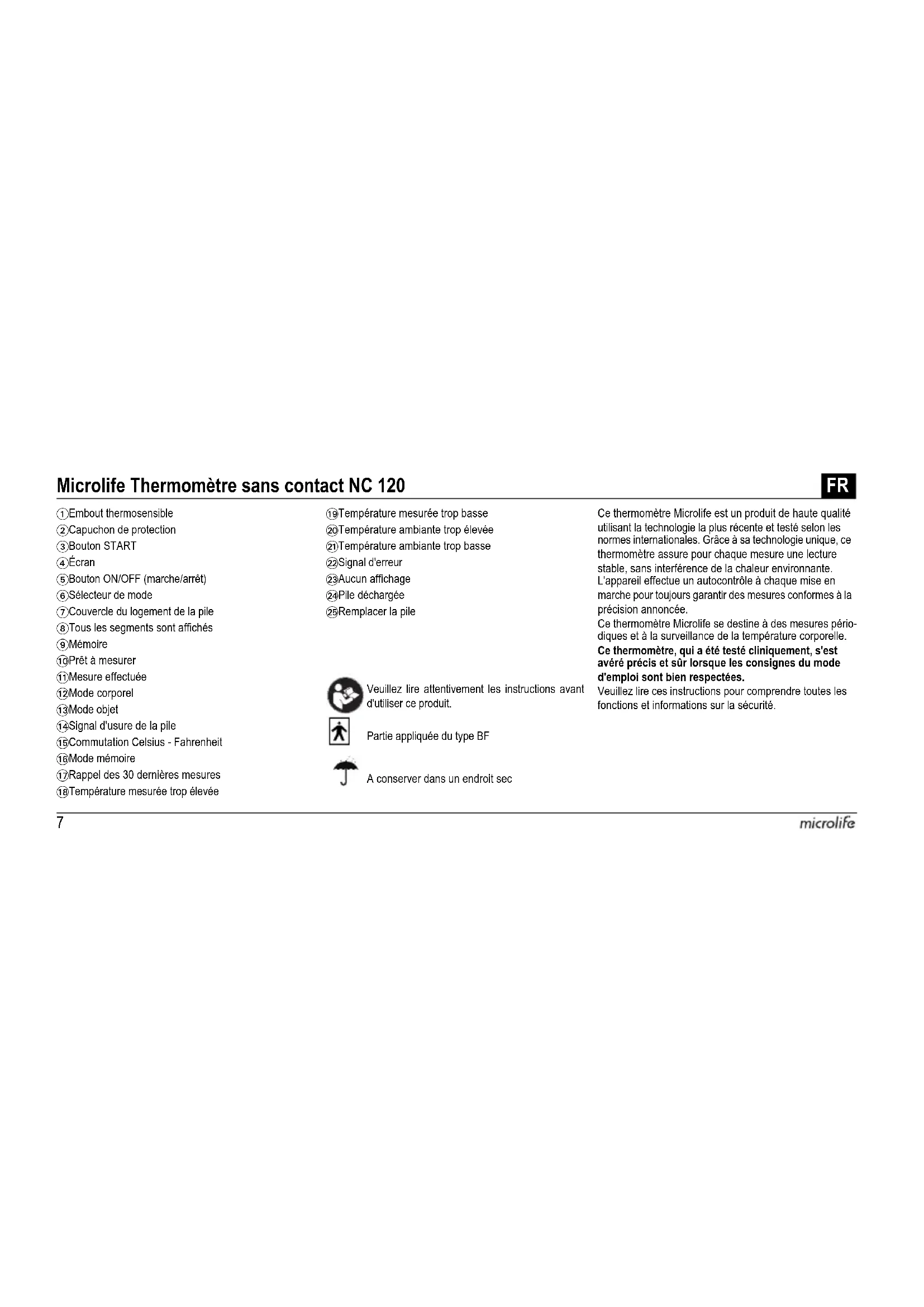 Expected service life: 5 years or 12000 measurements7 Veuillez lire attentivement les instructions avant d'utiliser ce produit. Partie appliquée du type BF Ce thermomètre Microlife est un produit de haute qualité utilisant la technologie la plus récente et testé selon les normes internationales. Grâce à sa technologie unique, ce thermomètre assure pour chaque mesure une lecture stable, sans interférence de la chaleur environnante. L'appareil effectue un autocontrôle à chaque mise en marche pour toujours garantir des mesures conformes à la précision annoncée. Ce thermomètre Microlife se destine à des mesures pério- diques et à la surveillance de la température corporelle. Ce thermomètre, qui a été testé cliniquement, s'est avéré précis et sûr lorsque les consignes du mode d'emploi sont bien respectées. Veuillez lire ces instructions pour comprendre toutes les fonctions et informations sur la sécurité. Microlife Thermomètre sans contact NC 120