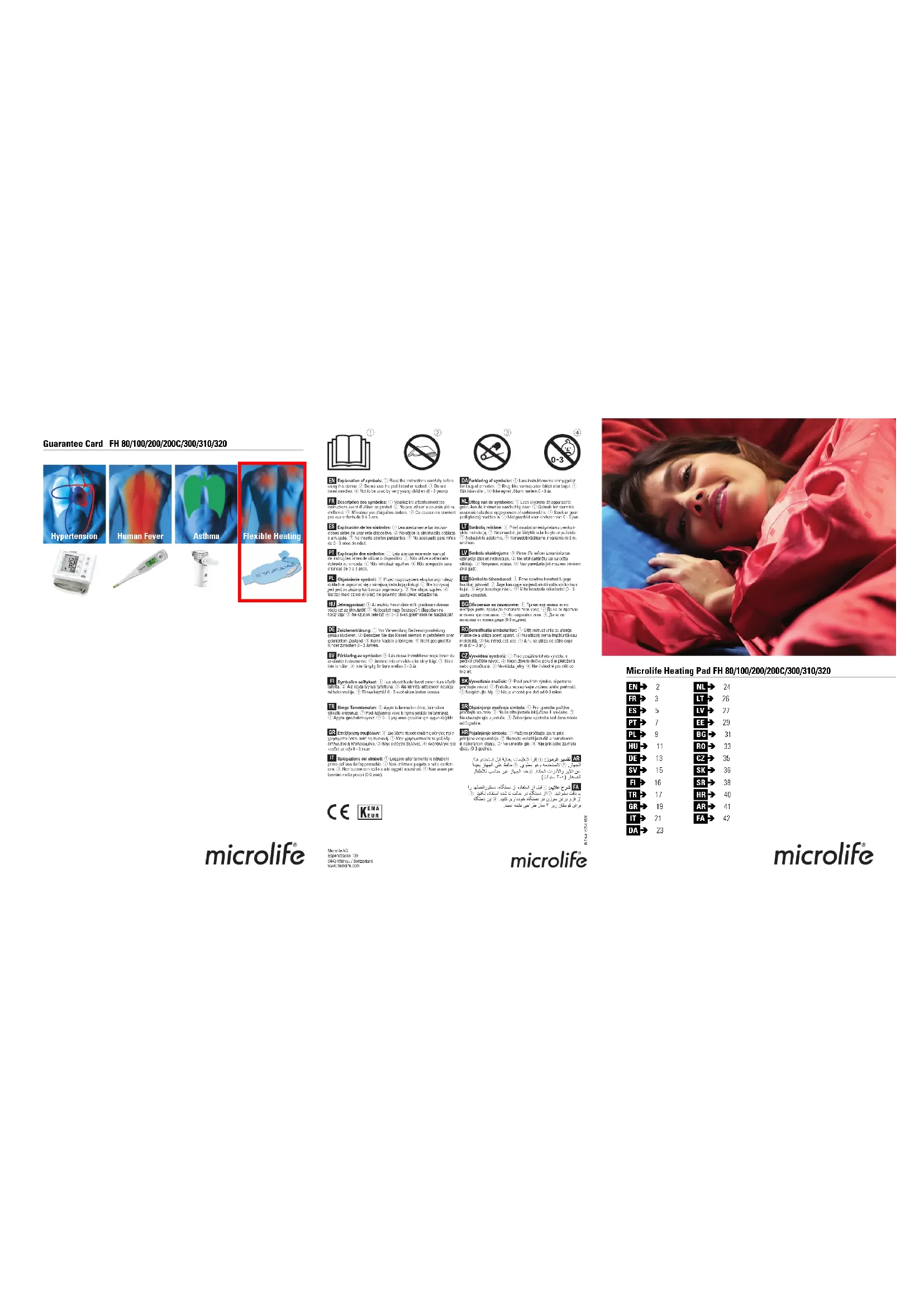 ˹ αϧΎέϓΕγυϭϔΣϣϧϓΕέϳϳϐΗϕΣϑϳϻϭέϳΎϣΕϳΎγΕϳΎγέΩΩϳϧϭΗϣέΎϣΕΎϣΩΧϭΕϻϭλΣϣΩέϭϣέΩϕϳϗΩΕΎϋϼρΩϳέϭΕγΩΑwww.microlife.comΗϧέΗϧϳ3FH 80/100/200/200C/300/310/320 Veuillez lire ce manuel attentivement avant d'utiliser ce produit. Ce produit ne se destine pas à une application médicale en milieu hospitalier. Il est réservé à un usage domestique. Pour éviter tout risque de choc électrique pendant l'emploi, veuillez prendre les précautions suivantes:- Evitez toute utilisation en cas d'humidité. Si le coussin est devenu humide, séchez-le bien avant de le mettre en oeuvre.- Utilisez le coussin seulement dans des locaux secs et aérés, ne l'utilisez pas dans une salle de bain, etc.!- Vérifiez l'état du coussin avant toute utilisation. Ne vous en servez pas si vous observez des défauts sur la commande manuelle, les interrupteurs, les connecteurs ou le coussin lui-même.- N'y insérez pas d'épingle ni aucun autre objet pointu. Pour éviter une surchauffe:- Ne laissez pas le coussin allumé sans surveillance. Mettez-le hors tension avant de quitter la pièce. - N'utilisez pas le coussin plié. - Evitez de froisser le coussin. Ne recouvrez pas la commande manuelle! Pour garantir un fonctionnement correct de la commande, ne pas la placer sur ou en dessous du coussin chauffant ou d'un autre objet.- N'enroulez pas le câble autour de la commande manuelle. N'appliquez pas le produit sur une personne incapable de bouger, insensible à la chaleur, sur un bébé ou sur des animaux. Ne laissez pas les enfants jouer avec le produit. Ne laissez jamais les enfants utiliser le produit sans surveillance. Les enfants en dessous de 8 ans ne doivent pas utiliser ce produit à moins qu'un adulte ait réglé sur la température la plus basse «1». Ce produit peut être utilisé par des enfants de 8 ans et plus ou par des personnes à mobilité réduite, ou en incapacité senso-rielle ou mentale ou sans connaissances du produit dans le cas où ces derniers auraient été correctement renseignés sur l'utilisation du produit et les dangers inhérents possibles. Une exposition excessive à une haute température peut provoquer des brûlures. Si le produit reste allumé longtemps, par exemple sur une personne qui s'endort, réglez-le sur un niveau adapté à une utilisation continue. Vérifiez fréquemment l'état du produit à la recherche de toute trace d'usure ou de dommage. Si vous observez de tels signes sur le produit ou si celui-ci a été mal utilisé, adressez-vous au fabricant ou au représentant agréé avant de continuer à vous en servir. Si le câble d'alimentation est endommagé, faites-le remplacer par le fabricant, son service après-vente ou des personnes ayant des qualifications similaires pour prévenir tout risque. N'essayez pas d'ouvrir ou de réparer le produit vous-même. Le réassemblage du produit nécessite des outils spéciaux. Le produit émet de très faibles champs éléctriques et magné-tiques qui pourraient perturber le bon fonctionnement de votre pacemaker. Ainsi, nous vous recommandons de demander l'avis de votre médecin et du fabricant de votre pacemaker. Laissez le produit refroidir avant de le plier et de le stocker dans un endroit sec. Ne placez pas d'objets lourds sur le produit pour éviter le flambage. Ne convient pas à un enfant de 0 à 3 ans! A ces âges les enfants sont incapables de réagir à la surchauffe.Les appareils électroniques doivent être éliminés en conformité avec les prescriptions locales, séparément des ordures ménagères.