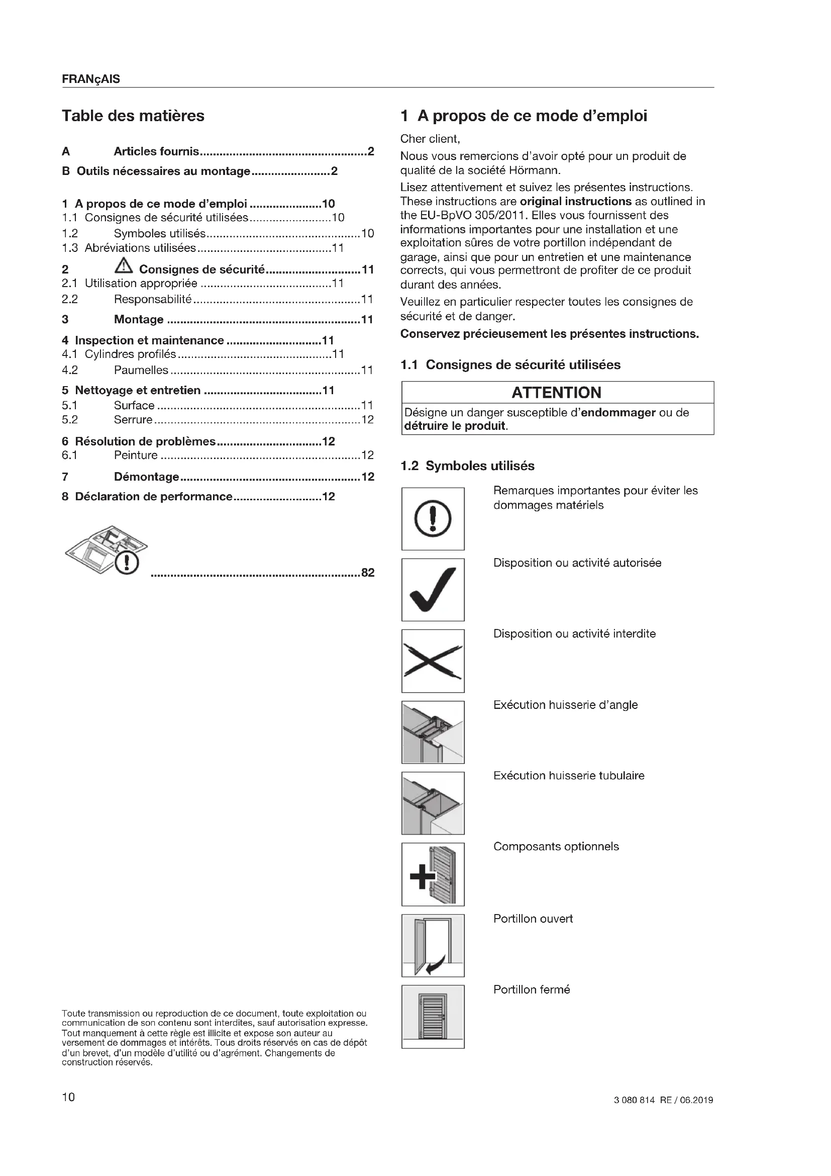 Remarques importantes pour éviter les dommages matériels Disposition ou activité autorisée Disposition ou activité interdite Exécution huisserie d’angle Exécution huisserie tubulaire Composants optionnels Portillon ouvert Portillon fermé 1 A propos de ce mode d’emploi ......................10