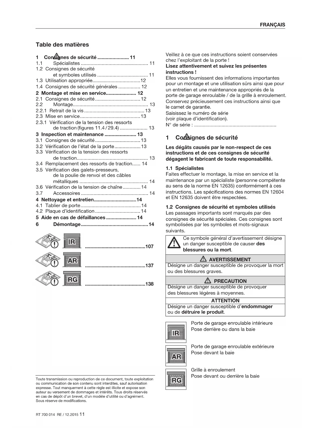 RT 700 084 RE / 12.2015 ENGLISHFR Porte de garage enroulable / Grille à enroulement Table des matières 1 Consignes de sécurité ....................... 11