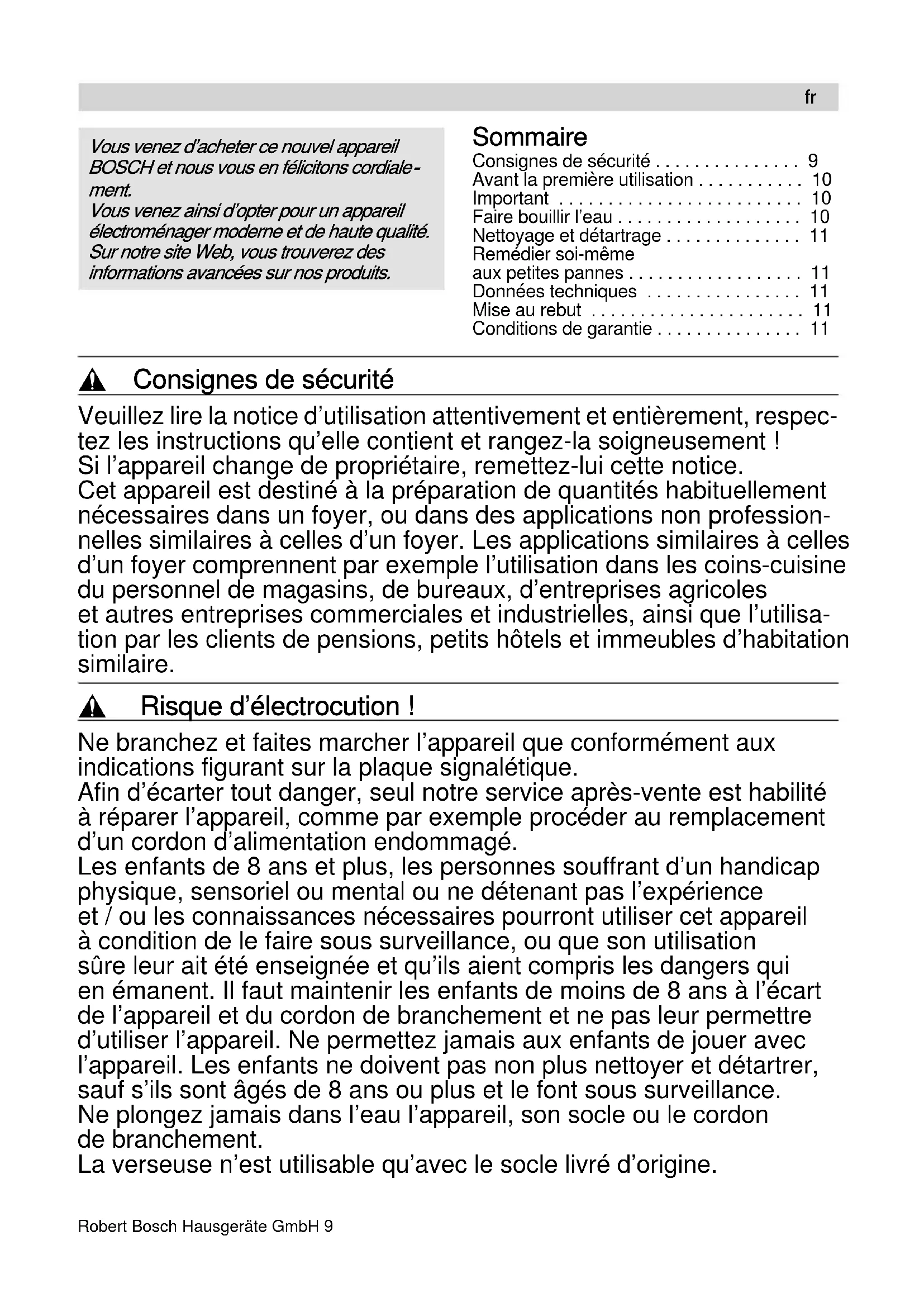 ment. Vous venez ainsi d’opter pour un appareil électroménager moderne et de haute qualité. Sur notre site Web, vous trouverez des informations avancées sur nos produits.10 Robert Bosch Hausgeräte GmbH N’utilisez l’appareil que si son cordon d’alimentation et l’appareil lui-même ne présentent aucun dommage. En cas de défaut, débranchez immédiatement la fiche mâle de la prise de courant ou coupez la tension du secteur. , Risque d’incendie ! Ne posez pas le socle ou la verseuse sur des surfaces très chaudes ou à proximité de celles-ci, par exemple sur les foyers d'une table de cuisson. , Risque d’ébouillantage ! Cet appareil chauffe pendant son utilisation. Pour cette raison, ne le saisissez que par les poignées et n’ouvrez le couvercle que lorsqu’il est froid. N’utilisez l’appareil qu’avec son couvercle encranté. Si vous remplissez l'appareil au-delà du repère de maximum,
