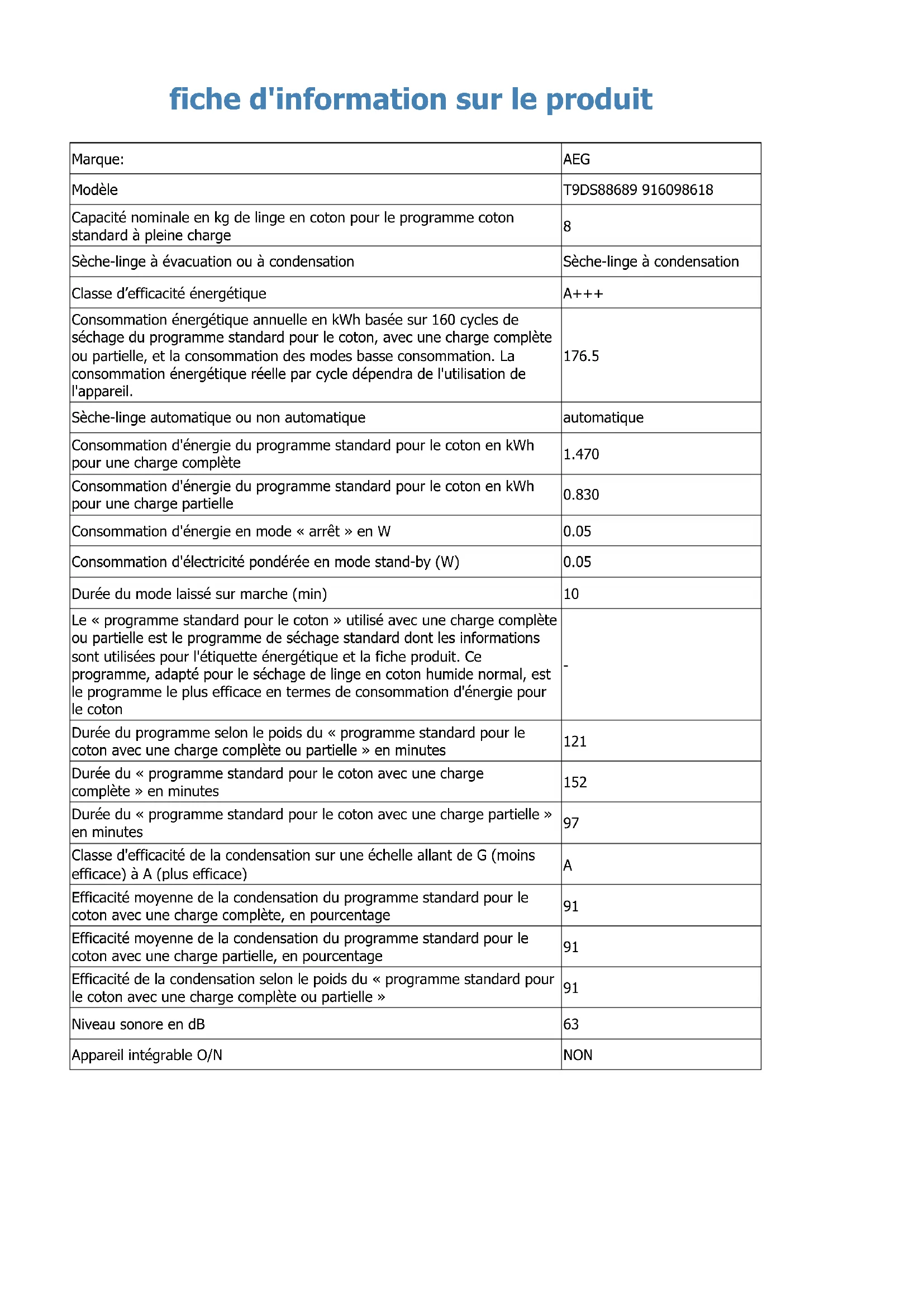 Marque: AEG Modèle T9DS88689 916098618 Capacité nominale en kg de linge en coton pour le programme coton standard à pleine charge